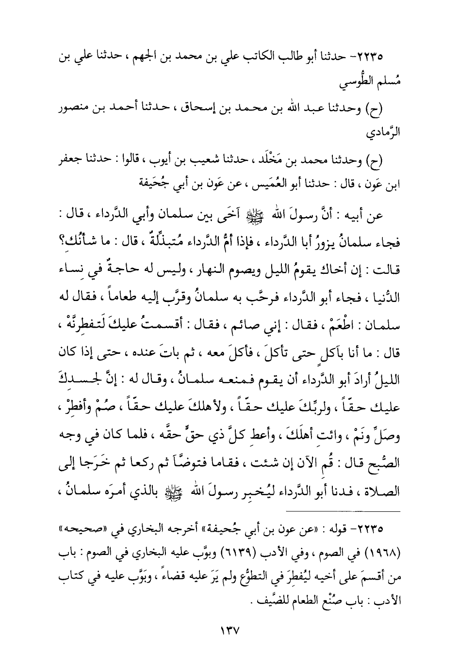 2235 - حَدَّثَنَا أَبُو طَالِبٍ الْكَاتِبُ عَلِيُّ بْنُ مُحَمَّدِ بْنِ الْجَهْمِ , ثنا عَلِيُّ بْنُ مُسْلِمٍ الطُّوسِيُّ , ح وَحَدَّثَنَا عَبْدُ اللَّهِ بْنُ مُحَمَّدِ بْنِ إِسْحَاقَ , ثنا أَحْمَدُ بْنُ مَنْصُورٍ الرَّمَادِيُّ , ثنا جَعْفَرُ بْنُ عَوْنٍ , نا أَبُو الْعُمَيْسِ , عَنْ عَوْنِ بْنِ أَبِي جُحَيْفَةَ , عَنْ أَبِيهِ , أَنَّ رَسُولَ اللَّهِ صَلَّى اللهُ عَلَيْهِ وَسَلَّمَ آخَى بَيْنَ سَلْمَانَ وَبَيْنَ أَبِي الدَّرْدَاءِ , قَالَ: فَجَاءَ سَلْمَانُ يَزُورُ أَبَا الدَّرْدَاءِ فَإِذَا أُمُّ الدَّرْدَاءِ مُتَبَذِّلَةً , قَالَ: مَا شَأْنُكِ؟ , قَالَتْ: إِنَّ أَخَاكَ يَقُومُ اللَّيْلَ وَيَصُومُ النَّهَارَ وَلَيْسَ لَهُ حَاجَةٌ فِي نِسَاءِ الدُّنْيَا , فَجَاءَ أَبُو الدَّرْدَاءِ فَرَحَّبَ بِهِ سَلْمَانُ وَقَرَّبَ إِلَيْهِ طَعَامًا , فَقَالَ لَهُ سَلْمَانُ: أَطْعِمْ , فَقَالَ: إِنِّي صَائِمٌ , فَقَالَ: أَقْسَمْتُ عَلَيْكَ لَتُفْطِرَنَّهُ , قَالَ: مَا أَنَا بِآكِلٍ حَتَّى تَأْكُلَ فَأَكَلَ مَعَهُ ثُمَّ بَاتَ عِنْدَهُ حَتَّى إِذَا كَانَ اللَّيْلُ أَرَادَ أَبُو الدَّرْدَاءِ أَنْ يَقُومَ فَمَنَعَهُ سَلْمَانُ وَقَالَ لَهُ: إِنَّ §لِجَسَدِكَ عَلَيْكَ حَقًّا , وَلِرَبِّكَ عَلَيْكَ حَقًّا , وَلِأَهْلِكَ عَلَيْكَ حَقًّا , صُمْ وَأَفْطِرْ , وَصَلِّ وَنَمْ , وَائْتِ أَهْلَكَ وَأَعْطِ كُلَّ ذِي حَقِّ حَقَّهُ , فَلَمَّا كَانَ فِي وَجْهِ الصُّبْحِ , قَالَ: قُمِ الْآنَ إِنْ شِئْتَ فَقَامَا فَتَوَضَّيَا ثُمَّ رَكَعَا ثُمَّ خَرَجَا إِلَى الصَّلَاةِ , فَدَنَا أَبُو الدَّرْدَاءِ لِيُخْبِرَ رَسُولَ اللَّهِ صَلَّى اللهُ عَلَيْهِ وَسَلَّمَ بِالَّذِي أَمَرَهُ سَلْمَانُ , -[138]- فَقَالَ لَهُ رَسُولُ اللَّهِ صَلَّى اللهُ عَلَيْهِ وَسَلَّمَ: «يَا أَبَا الدَّرْدَاءِ إِنَّ لِجَسَدِكَ عَلَيْكَ حَقًّا» مِثْلَ مَا قَالَ سَلْمَانُ. لَفْظُ أَبِي طَالِبٍ