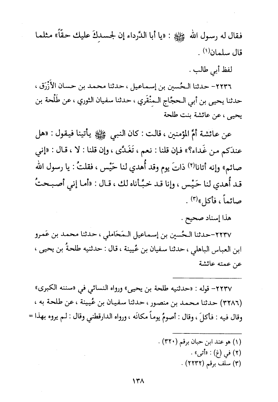 2236 - حَدَّثَنَا الْحُسَيْنُ بْنُ إِسْمَاعِيلَ , ثنا مُحَمَّدُ بْنُ حَسَّانَ الْأَزْرَقُ , ثنا يَحْيَى بْنُ أَبِي الْحَجَّاجِ الْمِنْقَرِيُّ , ثنا سُفْيَانُ الثَّوْرِيُّ , عَنْ طَلْحَةَ بْنِ يَحْيَى , عَنْ عَائِشَةَ بِنْتِ طَلْحَةَ , عَنْ عَائِشَةَ أُمِّ الْمُؤْمِنِينَ , قَالَتْ: كَانَ النَّبِيُّ صَلَّى اللهُ عَلَيْهِ وَسَلَّمَ يَأْتِينَا فَيَقُولُ: «§هَلْ عِنْدَكُمْ مِنْ غَدَاءٍ؟» , فَإِنْ قُلْنَا: نَعَمْ تَغَدَّى , وَإِنْ قُلْنَا: لَا قَالَ: «إِنِّي صَائِمٌ» , وَإِنَّهُ أَتَانَا ذَاتَ يَوْمٍ وَقَدْ أُهْدِيَ لَنَا حَيْسٌ , فَقُلْتُ: يَا رَسُولَ اللَّهِ قَدْ أُهْدِيَ لَنَا حَيْسٌ وَقَدْ خَبَّأْنَا لَكَ , فَقَالَ: «أَمَا إِنِّي أَصْبَحْتُ صَائِمًا فَأَكَلَ». وَهَذَا إِسْنَادٌ صَحِيحٌ