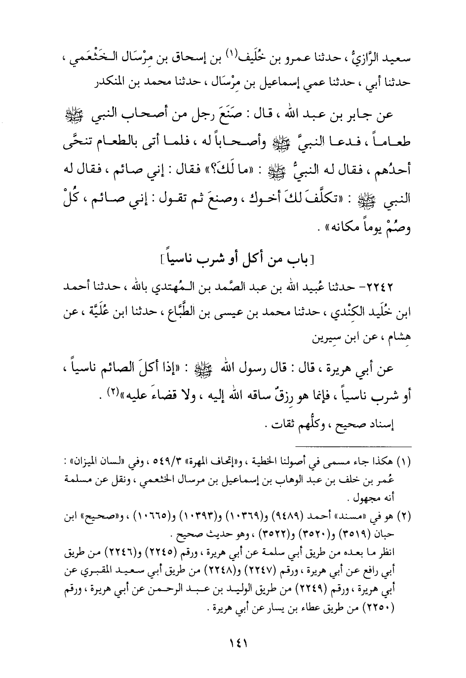 2242 - حَدَّثَنَا عُبَيْدُ اللَّهِ بْنُ عَبْدِ الصَّمَدِ بْنِ الْمُهْتَدِي بِاللَّهِ , ثنا أَحْمَدُ بْنُ خُلَيْدٍ الْكِنْدِيُّ , ثنا مُحَمَّدُ بْنُ عِيسَى بْنِ الطَّبَّاعِ , ثنا ابْنُ عُلَيَّةَ , عَنْ هِشَامٍ , عَنِ ابْنِ سِيرِينَ , عَنْ أَبِي هُرَيْرَةَ , قَالَ: قَالَ رَسُولُ اللَّهِ صَلَّى اللهُ عَلَيْهِ وَسَلَّمَ: § «إِذَا أَكَلَ الصَّائِمُ نَاسِيًا أَوْ شَرِبَ نَاسِيًا فَإِنَّمَا هُوَ رِزْقٌ سَاقَهُ اللَّهُ إِلَيْهِ وَلَا قَضَاءَ عَلَيْهِ». إِسْنَادٌ صَحِيحٌ وَكُلُّهُمْ ثِقَاتٌ