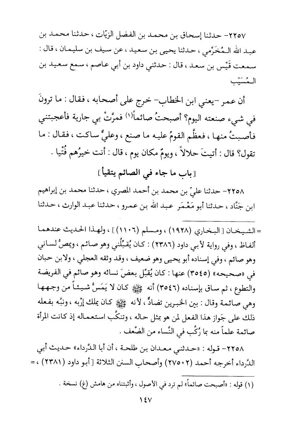 2257 - حَدَّثَنَا إِسْحَاقُ بْنُ مُحَمَّدِ بْنِ الْفَضْلِ الزَّيَّاتُ , ثنا مُحَمَّدُ بْنُ عَبْدِ اللَّهِ الْمُخَرِّمِيُّ , ثنا يَحْيَى بْنُ سَعِيدٍ , عَنْ سَيْفِ بْنِ سُلَيْمَانَ , قَالَ: سَمِعْتُ قَيْسَ بْنَ سَعْدٍ , حَدَّثَنِي دَاوُدُ بْنُ أَبِي عَاصِمٍ , سَمِعَ سَعِيدَ بْنَ الْمُسَيِّبِ , أَنَّ عُمَرَ خَرَجَ عَلَى أَصْحَابِهِ , فَقَالَ: مَا تَرَوْنَ فِي شَيْءٍ صَنَعْتُ الْيَوْمَ أَصْبَحْتُ صَائِمًا فَمَرَّتْ بِي جَارِيَةٌ فَأَعْجَبَتْنِي فَأَصَبْتُ مِنْهَا , فَعَظَّمَ الْقَوْمُ عَلَيْهِ مَا صَنَعَ , وَعَلِيُّ رَضِيَ اللَّهُ عَنْهُ سَاكِتٌ , فَقَالَ: مَا تَقُولُ؟ , قَالَ: «§أَتَيْتَ حَلَالًا , وَيَوْمٌ مَكَانَ يَوْمٍ» , قَالَ: أَنْتَ خَيْرُهُمْ فُتْيَا