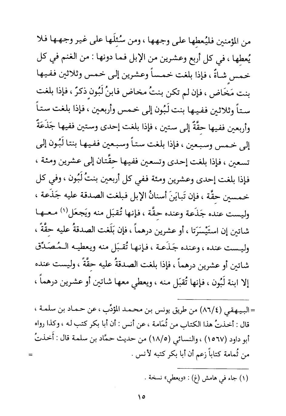 مِنَ الْمُؤْمِنِينَ فَلْيُعْطِهَا عَلَى وَجْهِهَا , وَمَنْ سُئِلَهَا عَلَى غَيْرِ وَجْهِهَا فَلَا يُعْطِهَا «فِي كُلِّ أَرْبَعٍ وَعِشْرِينَ مِنَ الْإِبِلِ فَمَا دُونَهَا الْغَنَمُ فِي كُلِّ خَمْسَةٍ شَاةٌ، فَإِذَا بَلَغَتْ خَمْسًا وَعِشْرِينَ إِلَى خَمْسٍ وَثَلَاثِينَ فَفِيهَا بِنْتُ مَخَاضٍ , فَإِنْ لَمْ تَكُنْ بِنْتُ مَخَاضٍ فَابْنُ لَبُونٍ ذَكَرٌ , فَإِذَا بَلَغَتْ سِتًّا وَثَلَاثِينَ فَفِيهَا بِنْتُ لَبُونٍ إِلَى خَمْسٍ وَأَرْبَعِينَ , فَإِذَا بَلَغَتْ سِتًّا وَأَرْبَعِينَ فَفِيهَا حِقَّةٌ إِلَى سِتِّينَ , فَإِذَا بَلَغَتْ إِحْدَى وَسِتِّينَ فَفِيهَا جَذَعَةٌ إِلَى خَمْسَةٍ وَسَبْعِينَ , فَإِذَا بَلَغَتْ سِتًّا وَسَبْعِينَ فَفِيهَا بِنْتَا لَبُونٍ إِلَى تِسْعِينَ , فَإِذَا بَلَغَتْ إِحْدَى وَتِسْعِينَ فَفِيهَا حِقَّتَانِ إِلَى عِشْرِينَ وَمِائَةٍ , فَإِذَا بَلَغَتْ إِحْدَى وَعِشْرِينَ وَمِائَةً فَفِي كُلِّ أَرْبَعِينَ بِنْتُ لَبُونٍ وَفِي كُلِّ خَمْسِينَ حِقَّةٌ , فَإِنْ تَبَايَنَ أَسْنَانُ الْإِبِلِ فَبَلَغَتِ الصَّدَقَةُ عَلَيْهِ جَذَعَةً وَلَيْسَتْ عِنْدَهُ جَذَعَةٌ وَعِنْدَهُ حِقَّةٌ فَإِنَّهَا تُقْبَلُ مِنْهُ وَيُعْطِي مَعَهَا شَاتَيْنِ إِنِ اسْتَيْسَرَتَا أَوْ عِشْرِينَ دِرْهَمًا , فَإِذَا بَلَغَتِ الصَّدَقَةُ حِقَّةً وَلَيْسَتْ عِنْدَهُ وَعِنْدَهُ جَذَعَةٌ فَإِنَّهَا تُقْبَلُ مِنْهُ وَيُعْطِيهِ الْمُصَّدِّقُ شَاتَيْنِ أَوْ عِشْرِينَ دِرْهَمًا , فَإِذَا بَلَغَتِ الصَّدَقَةُ عَلَيْهِ حِقَّةً وَلَيْسَتْ عِنْدَهُ إِلَّا ابْنَةُ لَبُونٍ فَإِنَّهَا تُقْبَلُ مِنْهُ وَيُعْطِي مَعَهَا شَاتَيْنِ أَوْ عِشْرِينَ دِرْهَمًا ,