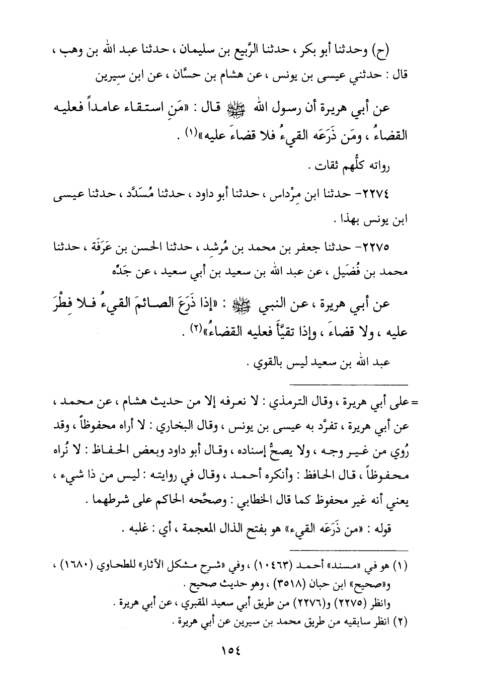 2275 - حَدَّثَنَا جَعْفَرُ بْنُ مُحَمَّدِ بْنِ مُرْشِدٍ , ثنا الْحَسَنُ بْنُ عَرَفَةَ , ثنا مُحَمَّدُ بْنُ فُضَيْلٍ , عَنْ عَبْدِ اللَّهِ بْنِ سَعِيدِ بْنِ أَبِي سَعِيدٍ , عَنْ جَدِّهِ , عَنْ أَبِي هُرَيْرَةَ , عَنِ النَّبِيِّ صَلَّى اللهُ عَلَيْهِ وَسَلَّمَ: § «إِذَا ذَرَعَ الصَّائِمَ الْقَيْءُ فَلَا فِطْرَ عَلَيْهِ وَلَا قَضَاءَ عَلَيْهِ وَإِذَا تَقَيَّأَ فَعَلَيْهِ الْقَضَاءُ». عَبْدُ اللَّهِ بْنُ سَعِيدٍ لَيْسَ بِقَوِيٍّ