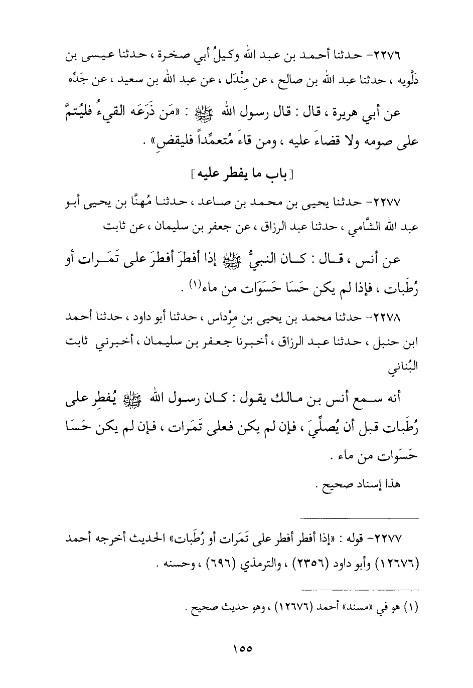 2278 - حَدَّثَنَا مُحَمَّدُ بْنُ يَحْيَى بْنِ مِرْدَاسٍ , ثنا أَبُو دَاوُدَ , نا أَحْمَدُ بْنُ حَنْبَلٍ , ثنا عَبْدُ الرَّزَّاقِ , أنا جَعْفَرُ بْنُ سُلَيْمَانَ , أَخْبَرَنِي ثَابِتٌ الْبُنَانِيُّ , أَنَّهُ سَمِعَ أَنَسَ بْنَ مَالِكٍ , يَقُولُ: «كَانَ رَسُولُ اللَّهِ صَلَّى اللهُ عَلَيْهِ وَسَلَّمَ §يُفْطِرُ عَلَى رُطَبَاتٍ قَبْلَ أَنْ يُصَلِّيَ , فَإِنْ لَمْ يَكُنْ فَعَلَى تَمَرَاتٍ , فَإِنْ لَمْ يَكُنْ حَسَا حَسَوَاتٍ مِنْ مَاءٍ». هَذَا إِسْنَادٌ صَحِيحٌ