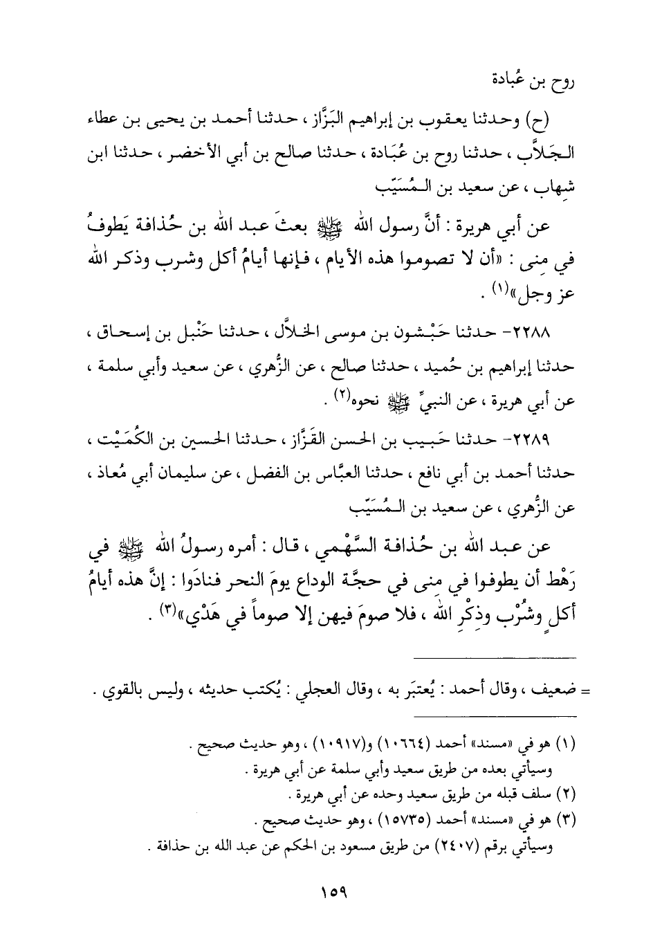 2289 - حَدَّثَنَا حَبِيبُ بْنُ الْحَسَنِ الْقَزَّازُ , ثنا الْحُسَيْنُ بْنُ الْكُمَيْتِ , ثنا أَحْمَدُ بْنُ أَبِي نَافِعٍ , ثنا الْعَبَّاسُ بْنُ الْفَضْلِ , عَنْ سُلَيْمَانَ أَبِي مُعَاذٍ , عَنِ الزُّهْرِيِّ , عَنْ سَعِيدِ بْنِ الْمُسَيِّبِ , عَنْ عَبْدِ اللَّهِ بْنِ حُذَافَةَ السَّهْمِيُّ , قَالَ: أَمَرَهُ رَسُولُ اللَّهِ صَلَّى اللهُ عَلَيْهِ وَسَلَّمَ فِي رَهْطٍ أَنْ يَطُوفُوا فِي مِنًى فِي حَجَّةِ الْوَدَاعِ يَوْمَ النَّحْرِ فَيُنَادُوا: «إِنَّ §هَذِهِ أَيَّامُ أَكْلٍ وَشُرْبٍ وَذِكْرِ اللَّهِ فَلَا تَصُومُوا فِيهِنَّ إِلَّا صَوْمًا فِي هَدْي»