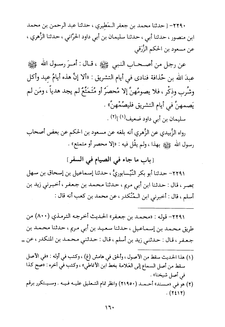 2290 - ثنا مُحَمَّدُ بْنُ جَعْفَرٍ الْمَطِيرِيُّ , ثنا عَبْدُ الرَّحْمَنِ بْنُ مُحَمَّدِ بْنِ مَنْصُورٍ , ثنا أَبِي , ثنا سُلَيْمَانُ بْنُ أَبِي دَاوُدَ الْحَرَّانِيُّ , ثنا الزُّهْرِيُّ , عَنْ مَسْعُودِ بْنِ الْحَكَمِ الزُّرَقِيِّ , عَنْ رَجُلٍ مِنْ أَصْحَابِ النَّبِيِّ صَلَّى اللهُ عَلَيْهِ وَسَلَّمَ , قَالَ: أَمَرَ رَسُولُ اللَّهِ صَلَّى اللهُ عَلَيْهِ وَسَلَّمَ عَبْدَ اللَّهِ بْنَ حُذَافَةَ فَنَادَى فِي أَيَّامِ التَّشْرِيقِ: «أَلَا إِنَّ §هَذِهِ أَيَّامُ عِيدٍ وَأَكْلٍ وَشُرْبٍ وَذِكْرٍ فَلَا يَصُومُهُنَّ إِلَّا مُحْصَرٌ , أَوْ مُتَمَتِّعٌ لَمْ يَجِدْ هَدْيًا , وَمَنْ لَمْ يَصُمْهُنَّ فِي أَيَّامِ الْحَجِّ الْمُتَتَابِعَةِ فَلْيَصُمْهُنَّ». سُلَيْمَانُ بْنُ أَبِي دَاوُدَ ضَعِيفٌ. رَوَاهُ الزُّبَيْدِيُّ , عَنِ الزُّهْرِيِّ , أَنَّهُ بَلَغَهُ عَنْ مَسْعُودِ بْنِ الْحَكَمِ , عَنْ بَعْضِ أَصْحَابِ رَسُولِ اللَّهِ صَلَّى اللهُ عَلَيْهِ وَسَلَّمَ بِهَذَا , وَلَمْ يَقُلْ فِيهِ: إِلَّا مُحْصَرًا , أَوْ مُتَمَتِّعًا