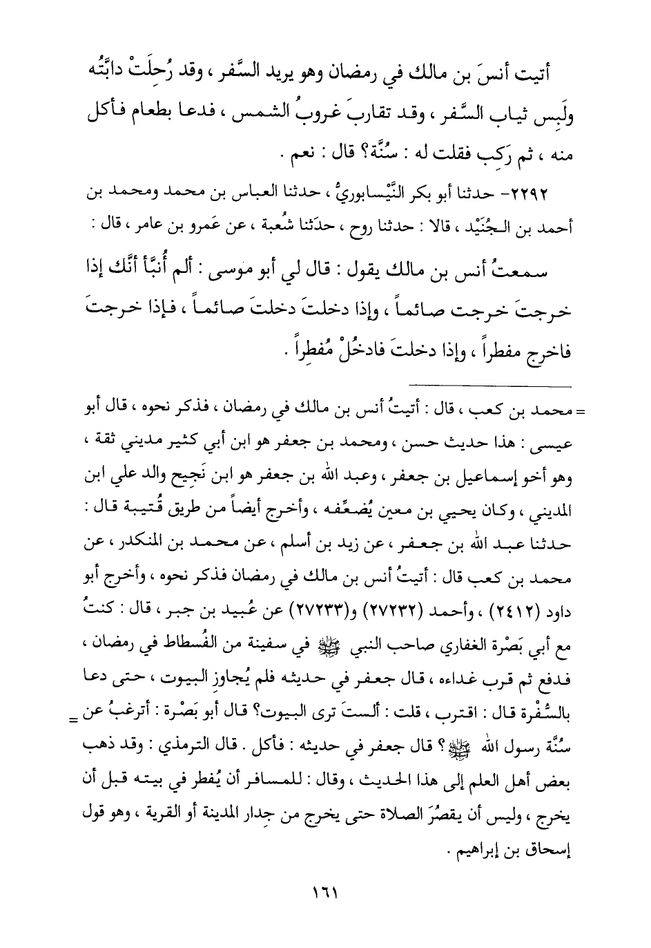 2292 - حَدَّثَنَا أَبُو بَكْرٍ النَّيْسَابُورِيُّ , ثنا الْعَبَّاسُ بْنُ مُحَمَّدٍ , وَمُحَمَّدُ بْنُ أَحْمَدَ بْنِ الْجُنَيْدِ , قَالَا: نا رَوْحٌ , ثنا شُعْبَةُ , عَنْ عَمْرِو بْنِ عَامِرٍ , قَالَ: سَمِعْتُ أَنَسَ بْنَ مَالِكٍ , يَقُولُ: قَالَ لِي أَبُو مُوسَى: «أَلَمْ أُنَبَّأْ أَنَّكَ إِذَا خَرَجْتَ خَرَجْتَ صَائِمًا وَإِذَا دَخَلْتَ دَخَلْتَ صَائِمًا , §فَإِذَا خَرَجْتَ فَاخْرُجْ مُفْطِرًا وَإِذَا دَخَلْتَ فَادْخُلْ مُفْطِرًا»