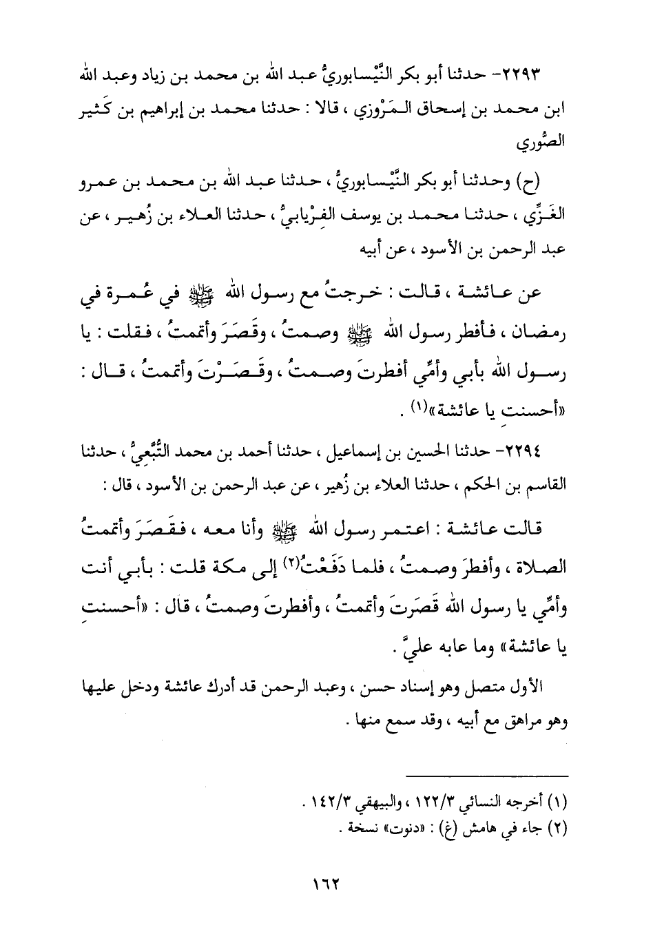 2294 - حَدَّثَنَا الْحُسَيْنُ بْنُ إِسْمَاعِيلَ , ثنا أَحْمَدُ بْنُ مُحَمَّدِ التُّبَّعِيُّ , حَدَّثَنَا الْقَاسِمُ بْنُ الْحَكَمِ , ثنا الْعَلَاءُ بْنُ زُهَيْرٍ , عَنْ عَبْدِ الرَّحْمَنِ بْنِ الْأَسْوَدِ , قَالَ: قَالَتْ عَائِشَةُ اعْتَمَرَ رَسُولُ اللَّهِ صَلَّى اللهُ عَلَيْهِ وَسَلَّمَ وَأَنَا مَعَهُ , فَقَصَرَ وَأَتْمَمْتُ الصَّلَاةَ , وَأَفْطَرَ وَصُمْتُ , فَلَمَّا دَنَوْتُ إِلَى مَكَّةَ , قُلْتُ: بِأَبِي أَنْتَ وَأُمِّي يَا رَسُولَ اللَّهِ §قَصَرْتَ وَأَتْمَمْتُ , وَأَفْطَرْتَ وَصُمْتُ , فَقَالَ: «أَحْسَنْتِ يَا عَائِشَةُ» , وَمَا عَابَهُ عَلَيَّ. قَالَ الشَّيْخُ: الْأَوَّلُ مُتَّصِلٌ وَهُوَ إِسْنَادٌ حَسَنٌ , وَعَبْدُ الرَّحْمَنِ قَدْ أَدْرَكَ عَائِشَةَ وَدَخَلَ عَلَيْهَا وَهُوَ مُرَاهِقٌ وَهُوَ مَعَ أَبِيهِ وَقَدْ سَمِعَ مِنْهَا
