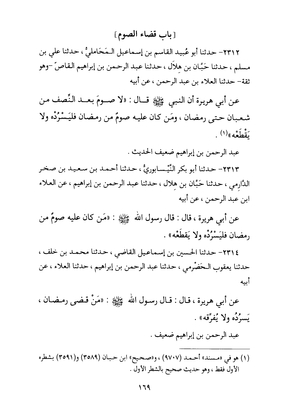 2312 - حَدَّثَنَا أَبُو عُبَيْدٍ الْقَاسِمُ بْنُ إِسْمَاعِيلَ الْمَحَامِلِيُّ , ثنا عَلِيُّ بْنُ الْمُثَنَّى , ثنا حَبَّانُ بْنُ هِلَالٍ , ثنا عَبْدُ الرَّحْمَنِ بْنُ إِبْرَاهِيمَ الْقَاصُّ وَهُوَ ثِقَةٌ , ثنا الْعَلَاءُ بْنُ عَبْدِ الرَّحْمَنِ , عَنْ أَبِيهِ , عَنْ أَبِي هُرَيْرَةَ , أَنَّ النَّبِيَّ صَلَّى اللهُ عَلَيْهِ وَسَلَّمَ قَالَ: § «لَا صَوْمَ بَعْدَ النِّصْفِ مِنْ شَعْبَانَ حَتَّى رَمَضَانَ , وَمَنْ كَانَ عَلَيْهِ صَوْمٌ مِنْ رَمَضَانَ فَلْيَسْرُدْهُ وَلَا يَقْطَعْهُ». عَبْدُ الرَّحْمَنِ بْنُ إِبْرَاهِيمَ ضَعِيفُ الْحَدِيثِ