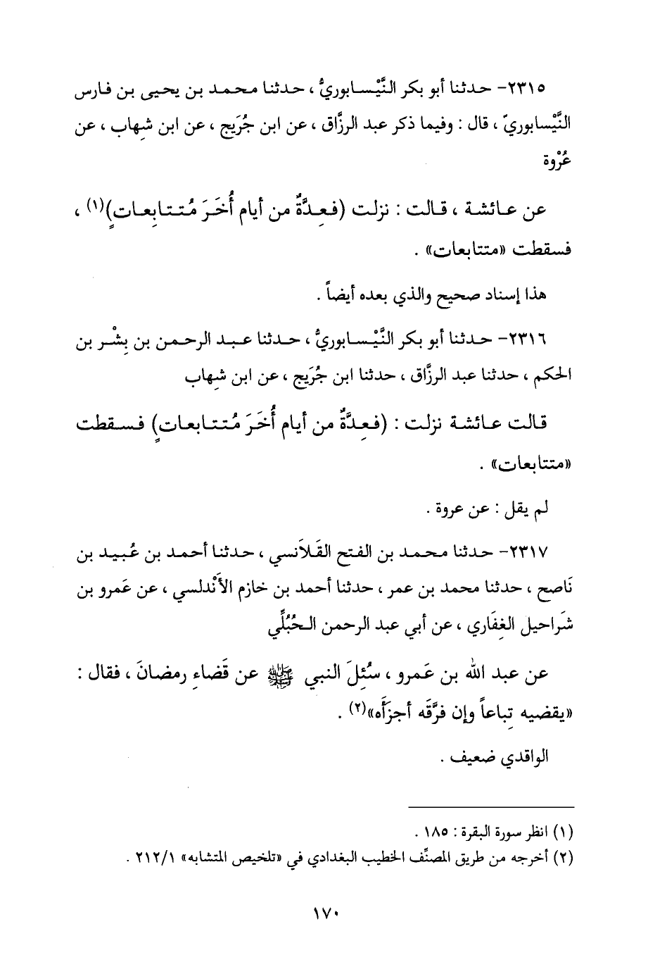 2315 - حَدَّثَنَا أَبُو بَكْرٍ النَّيْسَابُورِيُّ , حَدَّثَنَا مُحَمَّدُ بْنُ يَحْيَى بْنِ فَارِسٍ النَّيْسَابُورِيُّ , قَالَ: وَفِيمَا ذَكَرَ عَبْدُ الرَّزَّاقِ , عَنِ ابْنِ جُرَيْجٍ , عَنِ ابْنِ شِهَابٍ , عَنْ عُرْوَةَ , عَنْ عَائِشَةَ , قَالَتْ: " §نَزَلَتْ {فَعِدَّةٌ مِنْ أَيَّامٍ أُخَرَ} [البقرة: 184] مُتَتَابِعَاتٍ فَسَقَطَتْ مُتَتَابِعَاتٌ ". هَذَا إِسْنَادٌ صَحِيحٌ وَالَّذِي بَعْدَهُ أَيْضًا