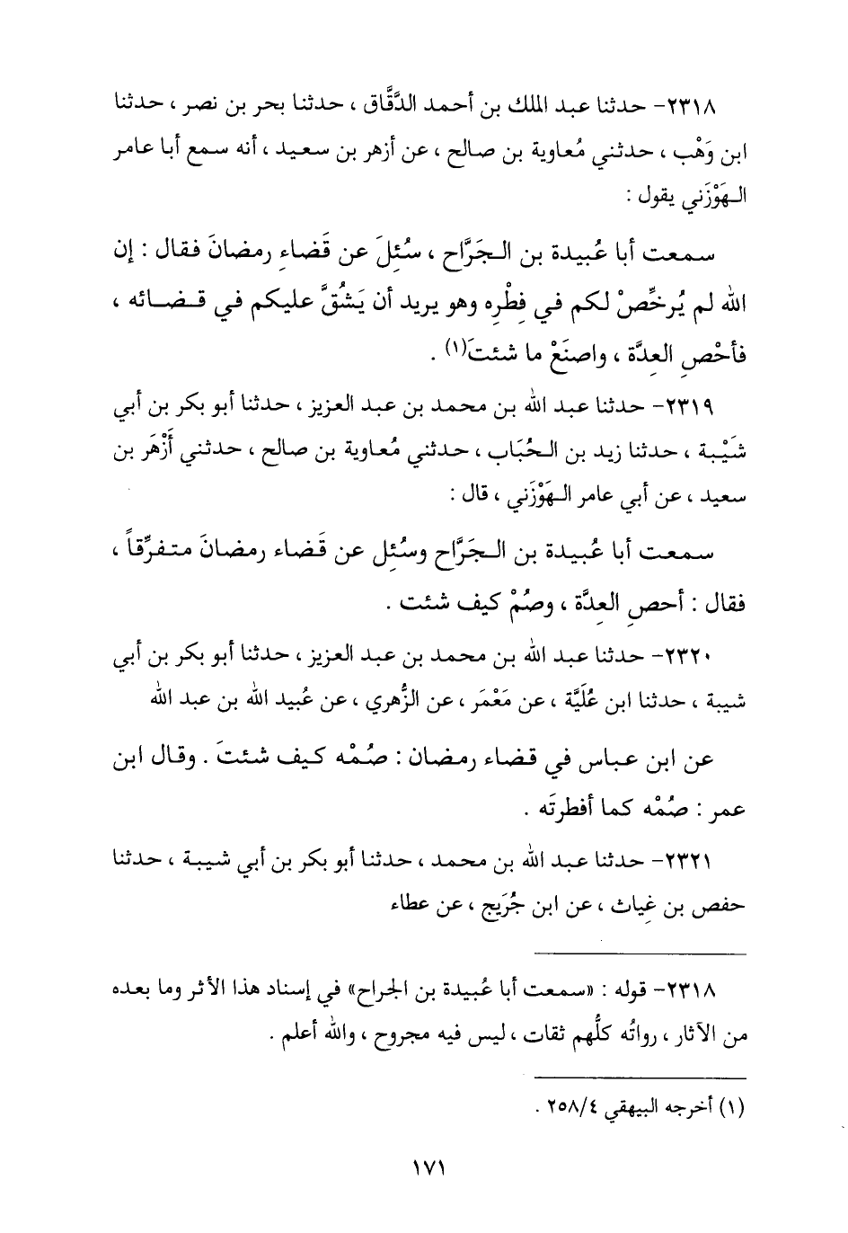 2318 - حَدَّثَنَا عَبْدُ الْمَلِكِ بْنُ أَحْمَدَ الدَّقَّاقُ , ثنا بَحْرُ بْنُ نَصْرٍ , ثنا ابْنُ وَهْبٍ , ثنا مُعَاوِيَةُ بْنُ صَالِحٍ , عَنْ أَزْهَرَ بْنِ سَعِيدٍ , أَنَّهُ سَمِعَ أَبَا عَامِرٍ الْهَوْزَنِيَّ , يَقُولُ: سَمِعْتُ أَبَا عُبَيْدَةَ بْنَ الْجَرَّاحِ سُئِلَ عَنْ قَضَاءِ رَمَضَانَ , فَقَالَ: «إِنَّ اللَّهَ §لَمْ يُرَخِّصْ لَكُمْ فِي فِطْرِهِ وَهُوَ لَا يُرِيدُ أَنْ يَشُقَّ عَلَيْكُمْ فِي قَضَائِهِ , فَأَحْصِ الْعِدَّةَ وَاصْنَعْ مَا شِئْتَ»