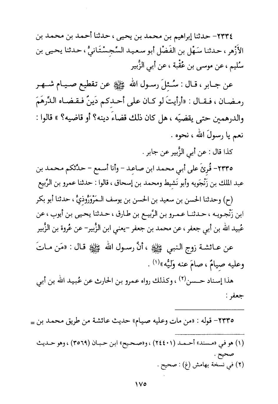 2335 - قُرِئَ عَلَى ابْنِ صَاعِدٍ , وَأَنَا أَسْمَعُ: حَدَّثَكُمْ مُحَمَّدُ بْنُ عَبْدِ الْمَلِكِ بْنِ زَنْجُوَيْهِ , وَأَبُو نَشِيطٍ , وَمُحَمَّدُ بْنُ إِسْحَاقَ قَالُوا: ثنا عَمْرُو بْنُ الرَّبِيعِ , ح وَحَدَّثَنَا الْحَسَنُ بْنُ سَعِيدِ بْنِ الْحَسَنِ بْنِ يُوسُفَ الْمَرْوَرُوذِيُّ , ثنا أَبُو بَكْرِ بْنُ زَنْجُوَيْهِ , عَنْ عَمْرِو بْنِ الرَّبِيعِ بْنِ طَارِقٍ , ثنا يَحْيَى بْنُ أَيُّوبَ , عَنْ عُبَيْدِ اللَّهِ بْنِ أَبِي جَعْفَرٍ , عَنْ مُحَمَّدِ بْنِ جَعْفَرِ بْنِ الزُّبَيْرِ , عَنْ عُرْوَةَ بْنِ الزُّبَيْرِ , عَنْ عَائِشَةَ زَوْجِ النَّبِيِّ صَلَّى اللهُ عَلَيْهِ وَسَلَّمَ , أَنَّ رَسُولَ اللَّهِ صَلَّى اللهُ عَلَيْهِ وَسَلَّمَ , قَالَ: § «مَنْ مَاتَ وَعَلَيْهِ صِيَامٌ صَامَ عَنْهُ وَلِيُّهُ». هَذَا إِسْنَادٌ صَحِيحٌ. وَكَذَلِكَ رَوَاهُ عَمْرُو بْنُ الْحَارِثِ , عَنْ عُبَيْدِ اللَّهِ بْنِ أَبِي جَعْفَرٍ