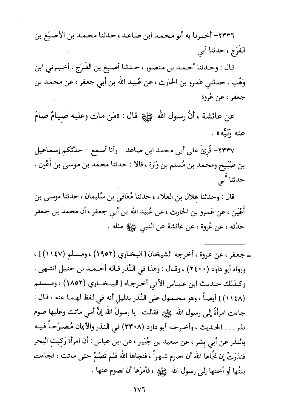 2336 - حَدَّثَنَا بِهِ أَبُو مُحَمَّدِ بْنُ صَاعِدٍ , ثنا مُحَمَّدُ بْنُ الْأَصْبَغِ بْنِ الْفَرَجِ , حَدَّثَنَا أَبِي , قَالَ: وَحَدَّثَنَا أَحْمَدُ بْنُ مَنْصُورٍ , ثنا أَصْبَغُ بْنُ الْفَرَجِ , أَخْبَرَنِي ابْنُ وَهْبٍ , حَدَّثَنِي عَمْرُو بْنُ الْحَارِثِ , عَنْ عُبَيْدِ اللَّهِ بْنِ أَبِي جَعْفَرٍ , عَنْ مُحَمَّدِ بْنِ جَعْفَرٍ , عَنْ عُرْوَةَ , عَنْ عَائِشَةَ , أَنَّ رَسُولَ اللَّهِ صَلَّى اللهُ عَلَيْهِ وَسَلَّمَ , قَالَ: § «مَنْ مَاتَ وَعَلَيْهِ صِيَامٌ صَامَ عَنْهُ وَلِيُّهُ».