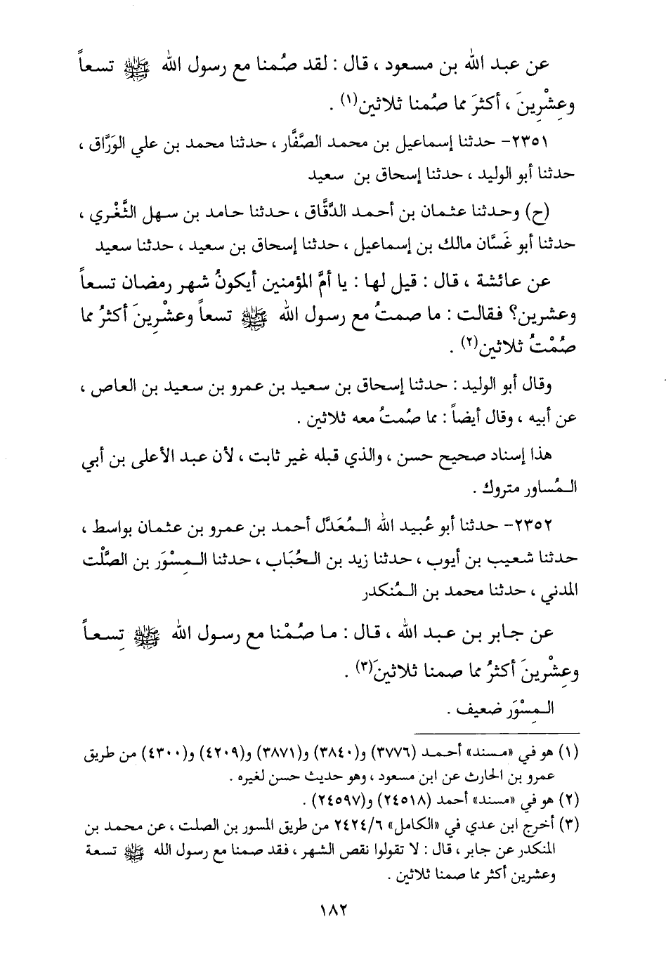 2351 - حَدَّثَنَا إِسْمَاعِيلُ بْنُ مُحَمَّدٍ الصَّفَّارُ , حَدَّثَنَا مُحَمَّدُ بْنُ عَلِيٍّ الْوَرَّاقُ , ثنا أَبُو الْوَلِيدِ , ثنا إِسْحَاقُ بْنُ سَعِيدٍ , ح وَحَدَّثَنَا عُثْمَانُ بْنُ أَحْمَدَ الدَّقَّاقُ , ثنا حَامِدُ بْنُ سَهْلٍ الثَّغْرِيُّ , ثنا أَبُو غَسَّانَ مَالِكُ بْنُ إِسْمَاعِيلَ , نا إِسْحَاقُ بْنُ سَعِيدٍ , ثنا سَعِيدٌ , عَنْ عَائِشَةَ , قَالَتْ: قِيلَ لَهَا: يَا أُمَّ الْمُؤْمِنِينَ أَيَكُونُ شَهْرُ رَمَضَانَ تِسْعًا وَعِشْرِينَ؟ , فَقَالَتْ: § «مَا صُمْتُ مَعَ رَسُولِ اللَّهِ صَلَّى اللهُ عَلَيْهِ وَسَلَّمَ تِسْعًا وَعِشْرِينَ أَكْثَرُ مِمَّا صُمْتُ ثَلَاثِينَ». وَقَالَ أَبُو الْوَلِيدِ: ثنا إِسْحَاقُ بْنُ سَعِيدِ بْنِ عَمْرِو بْنِ سَعِيدِ بْنِ الْعَاصِ , عَنْ أَبِيهِ , وَقَالَ أَيْضًا: مِمَّا صُمْتُ مَعَهُ ثَلَاثِينَ. هَذَا إِسْنَادٌ صَحِيحٌ حَسَنٌ وَالَّذِي قَبْلَهُ غَيْرُ ثَابِتٍ , لِأَنَّ عَبْدَ الْأَعْلَى بْنَ أَبِي الْمُسَاوِرِ مَتْرُوكٌ