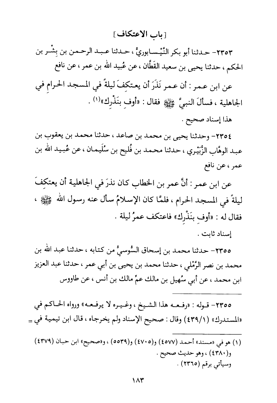 2354 - وَحَدَّثَنَا يَحْيَى بْنُ صَاعِدٍ , ثنا مُحَمَّدُ بْنُ يَعْقُوبَ بْنِ عَبْدِ الْوَهَّابِ الزُّبَيْرِيُّ , ثنا مُحَمَّدُ بْنُ فُلَيْحِ بْنِ سُلَيْمَانَ , عَنْ عُبَيْدِ اللَّهِ بْنِ عُمَرَ , عَنْ نَافِعٍ , عَنِ ابْنِ عُمَرَ , أَنَّ عُمَرَ بْنَ الْخَطَّابِ رَضِيَ اللَّهُ عَنْهُ كَانَ نَذَرَ فِي الْجَاهِلِيَّةِ أَنْ يَعْتَكِفَ لَيْلَةً فِي الْمَسْجِدِ الْحَرَامِ فَلَمَّا كَانَ الْإِسْلَامُ سَأَلَ عَنْهُ رَسُولَ اللَّهِ صَلَّى اللهُ عَلَيْهِ وَسَلَّمَ , فَقَالَ لَهُ: § «أَوْفِ بِنَذْرِكَ». فَاعْتَكَفَ عُمَرُ لَيْلَةً. إِسْنَادٌ ثَابِتٌ