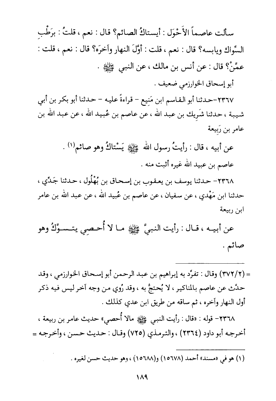 2368 - حَدَّثَنَا يُوسُفُ بْنُ يَعْقُوبَ بْنِ إِسْحَاقَ بْنِ بُهْلُولٍ , ثنا جَدِّي , ثنا ابْنُ مَهْدِيٍّ , عَنْ سُفْيَانَ , عَنْ عَاصِمِ بْنِ عُبَيْدِ اللَّهِ , عَنْ عَبْدِ اللَّهِ بْنِ عَامِرِ بْنِ رَبِيعَةَ , عَنْ أَبِيهِ , قَالَ: رَأَيْتُ النَّبِيَّ صَلَّى اللهُ عَلَيْهِ وَسَلَّمَ مَا لَا أُحْصِي § «يَتَسَوَّكُ وَهُوَ صَائِمٌ». -[190]-