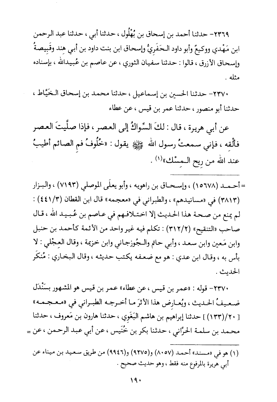 2370 - حَدَّثَنَا الْحُسَيْنُ بْنُ إِسْمَاعِيلَ , ثنا مُحَمَّدُ بْنُ إِسْحَاقَ الْخَيَّاطُ , ثنا أَبُو مَنْصُورٍ , ثنا عُمَرُ بْنُ قَيْسٍ , عَنْ عَطَاءٍ , عَنْ أَبِي هُرَيْرَةَ , قَالَ: لَكَ السِّوَاكُ إِلَى الْعَصْرِ فَإِذَا صَلَّيْتَ الْعَصْرَ فَأَلْقِهِ , فَإِنِّي سَمِعْتُ رَسُولَ اللَّهِ صَلَّى اللهُ عَلَيْهِ وَسَلَّمَ , يَقُولُ: § «خَلُوفُ فَمِ الصَّائِمِ أَطْيَبُ عِنْدَ اللَّهِ مِنْ رِيحِ الْمِسْكِ»