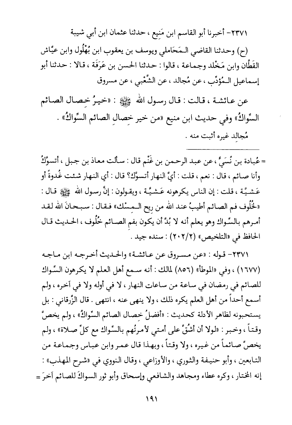 2371 - حَدَّثَنَا أَبُو الْقَاسِمِ بْنُ مَنِيعٍ , ثنا عُثْمَانُ بْنُ أَبِي شَيْبَةَ , ح وَحَدَّثَنَا الْقَاضِي الْمَحَامِلِيُّ , وَيُوسُفُ بْنُ يَعْقُوبَ بْنِ بُهْلُولٍ , وَابْنُ عَيَّاشٍ الْقَطَّانُ , وَابْنُ مَخْلَدٍ وَجَمَاعَةٌ قَالُوا: ثنا الْحَسَنُ بْنُ عَرَفَةَ , قَالَا: حَدَّثَنَا أَبُو إِسْمَاعِيلَ الْمُؤَدِّبُ , عَنْ مُجَالِدٍ , عَنِ الشَّعْبِيِّ , عَنْ مَسْرُوقٍ , عَنْ عَائِشَةَ , قَالَتْ: قَالَ رَسُولُ اللَّهِ صَلَّى اللهُ عَلَيْهِ وَسَلَّمَ: § «خَيْرُ خِصَالِ الصَّائِمِ السِّوَاكُ». وَفِي حَدِيثِ ابْنِ مَنِيعٍ: «مِنْ خَيْرِ خِصَالِ الصَّائِمِ السِّوَاكُ». مُجَالِدٌ غَيْرُهُ أَثْبَتُ مِنْهُ