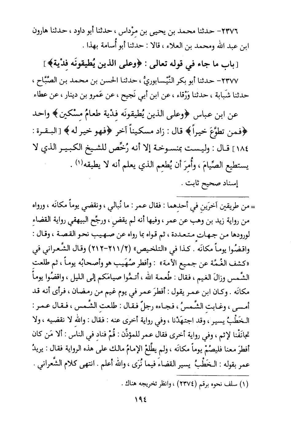 2377 - حَدَّثَنَا أَبُو بَكْرٍ النَّيْسَابُورِيُّ , ثنا الْحَسَنُ بْنُ مُحَمَّدِ بْنِ الصَّبَّاحِ , حَدَّثَنَا شَبَابَةُ , ثنا وَرْقَاءُ , عَنِ ابْنِ أَبِي نَجِيحٍ , عَنْ عَمْرِو بْنِ دِينَارٍ , عَنْ عَطَاءٍ , عَنِ ابْنِ عَبَّاسٍ {وَعَلَى الَّذِينَ يُطِيقُونَهُ فِدْيَةٌ طَعَامُ مِسْكِينٍ} [البقرة: 184] «وَاحِدٍ» , {فَمَنْ تَطَوَّعَ خَيْرًا} [البقرة: 184] , قَالَ: «زَادَ مِسْكِينًا آخَرَ» {فَهُوَ خَيْرٌ} [البقرة: 184] , قَالَ: «وَلَيْسَتْ بِمَنْسُوخَةٍ إِلَّا أَنَّهُ §رَخَّصَ لِلشَّيْخِ الْكَبِيرِ الَّذِي لَا يَسْتَطِيعُ الصِّيَامَ وَأُمِرَ أَنْ يُطْعِمَ الَّذِي يَعْلَمُ أَنَّهُ لَا يُطِيقُهُ». إِسْنَادٌ صَحِيحٌ ثَابِتٌ