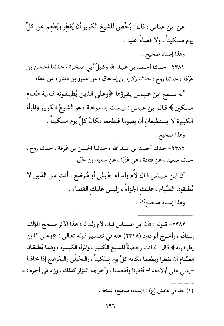 2381 - حَدَّثَنَا أَحْمَدُ بْنُ عَبْدِ اللَّهِ وَكِيلُ أَبِي صَخْرَةَ , ثنا الْحَسَنُ بْنُ عَرَفَةَ , ثنا رَوْحٌ , ثنا زَكَرِيَّا بْنُ إِسْحَاقَ , عَنْ عَمْرِو بْنِ دِينَارٍ , عَنْ عَطَاءٍ , أَنَّهُ سَمِعَ ابْنَ عَبَّاسٍ , يَقْرَؤُهَا {وَعَلَى الَّذِينَ يُطِيقُونَهُ فِدْيَةٌ طَعَامُ مِسْكِينٍ} [البقرة: 184] , قَالَ ابْنُ عَبَّاسٍ: «لَيْسَتْ بِمَنْسُوخَةٍ §هُوَ الشَّيْخُ الْكَبِيرُ وَالْمَرْأَةُ لَا يَسْتَطِيعَانِ أَنْ يَصُومَا فَيُطْعِمَا مَكَانَ كُلِّ يَوْمٍ مِسْكِينًا». وَهَذَا صَحِيحٌ