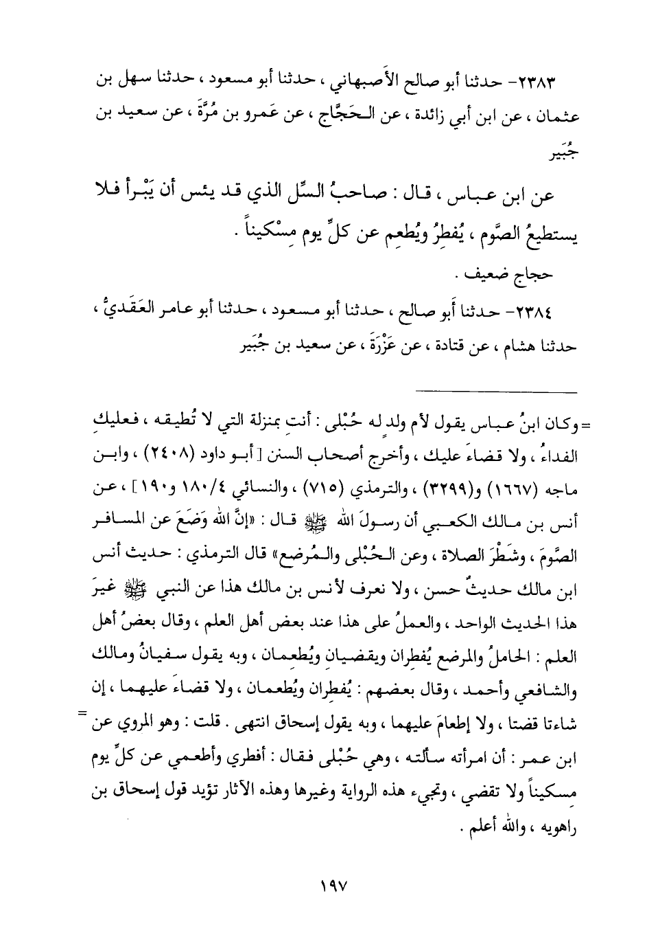 2383 - حَدَّثَنَا أَبُو صَالِحٍ الْأَصْبَهَانِيُّ , ثنا أَبُو مَسْعُودٍ , ثنا سَهْلُ بْنُ عُثْمَانَ , عَنِ ابْنِ أَبِي زَائِدَةَ , عَنِ الْحَجَّاجِ , عَنْ عَمْرِو بْنِ مُرَّةَ , عَنْ سَعِيدِ بْنِ جُبَيْرٍ , عَنِ ابْنِ عَبَّاسٍ , قَالَ: § «صَاحِبُ السُّلِّ الَّذِي قَدْ يَئِسَ أَنْ يَبْرَأَ فَلَا يَسْتَطِيعُ الصَّوْمَ يُفْطِرُ وَيُطْعِمُ عَنْ كُلِّ يَوْمٍ مِسْكِينًا». حَجَّاجٌ ضَعِيفٌ