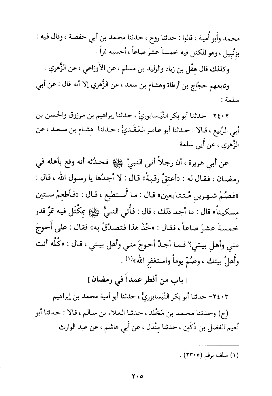 2402 - حَدَّثَنَا أَبُو بَكْرٍ النَّيْسَابُورِيُّ , ثنا إِبْرَاهِيمُ بْنُ مَرْزُوقٍ , وَالْحَسَنُ بْنُ أَبِي الرَّبِيعِ , قَالَا: نا أَبُو عَامِرٍ الْعَقَدِيُّ , ثنا هِشَامُ بْنُ سَعْدٍ , عَنِ الزُّهْرِيِّ , عَنْ أَبِي سَلَمَةَ , عَنْ أَبِي هُرَيْرَةَ , أَنَّ رَجُلًا أَتَى إِلَى النَّبِيِّ صَلَّى اللهُ عَلَيْهِ وَسَلَّمَ فَحَدَّثَهُ أَنَّهُ §وَقَعَ بِأَهْلِهِ فِي رَمَضَانَ , فَقَالَ لَهُ: «أَعْتِقْ رَقَبَةً» , قَالَ: لَا أَجِدُهَا يَا رَسُولَ اللَّهِ , قَالَ: «فَصُمْ شَهْرَيْنِ مُتَتَابِعَيْنِ» , قَالَ: مَا أَسْتَطِيعُ , قَالَ: «فَأَطْعِمْ سِتِّينَ مِسْكِينًا» , قَالَ: مَا أَجِدُ ذَلِكَ , قَالَ: فَأُتِيَ النَّبِيُّ صَلَّى اللهُ عَلَيْهِ وَسَلَّمَ بِمِكْتَلٍ فِيهِ تَمْرٌ قَدْرَ خَمْسَةَ عَشَرَ صَاعًا , فَقَالَ: «خُذْ هَذَا فَتَصَدَّقْ بِهِ» , قَالَ: عَلَى أَحْوَجَ مِنِّي وَأَهْلِ بَيْتِي فَمَا أَجِدُ أَحْوَجَ مِنِّي وَأَهْلِ بَيْتِي , قَالَ: «كُلْهُ أَنْتَ وَأَهْلُ بَيْتِكَ وَصُمْ يَوْمًا وَاسْتَغْفِرِ اللَّهَ»