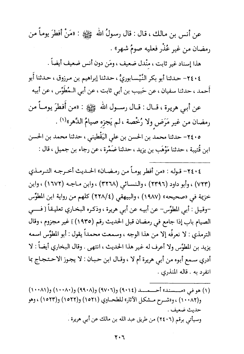 2404 - حَدَّثَنَا أَبُو بَكْرٍ النَّيْسَابُورِيُّ , ثنا إِبْرَاهِيمُ بْنُ مَرْزُوقٍ , ثنا أَبُو أَحْمَدَ , ثنا سُفْيَانُ , عَنْ حَبِيبِ بْنِ أَبِي ثَابِتٍ , عَنْ أَبِي الْمُطَوِّسِ , عَنْ أَبِيهِ , عَنْ أَبِي هُرَيْرَةَ , قَالَ: قَالَ رَسُولُ اللَّهِ صَلَّى اللهُ عَلَيْهِ وَسَلَّمَ: § «مَنْ أَفْطَرَ يَوْمًا مِنْ رَمَضَانَ مِنْ غَيْرِ مَرَضٍ وَلَا رُخْصَةٍ لَمْ يُجْزِهِ صِيَامُ الدَّهْرِ»