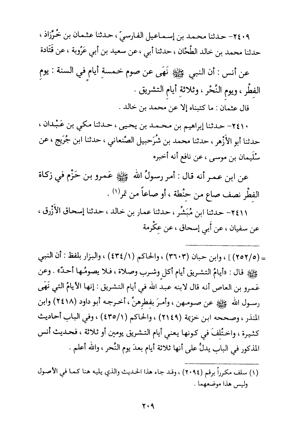 2409 - حَدَّثَنَا مُحَمَّدُ بْنُ إِسْمَاعِيلَ الْفَارِسِيُّ , ثنا عُثْمَانُ بْنُ خُرَّزَاذَ , ثنا مُحَمَّدُ بْنُ خَالِدٍ الطَّحَّانُ , ثنا أَبِي , عَنْ سَعِيدِ بْنِ أَبِي عَرُوبَةَ , عَنْ قَتَادَةَ , عَنْ أَنَسٍ , أَنَّ النَّبِيَّ صَلَّى اللهُ عَلَيْهِ وَسَلَّمَ " §نَهَى عَنْ صَوْمِ خَمْسَةِ أَيَّامٍ فِي السَّنَةِ: يَوْمِ الْفِطْرِ , وَيَوْمِ النَّحْرِ , وَثَلَاثَةِ أَيَّامِ التَّشْرِيقِ ". قَالَ عُثْمَانُ: مَا كَتَبْنَاهُ إِلَّا عَنْ مُحَمَّدِ بْنِ خَالِدٍ