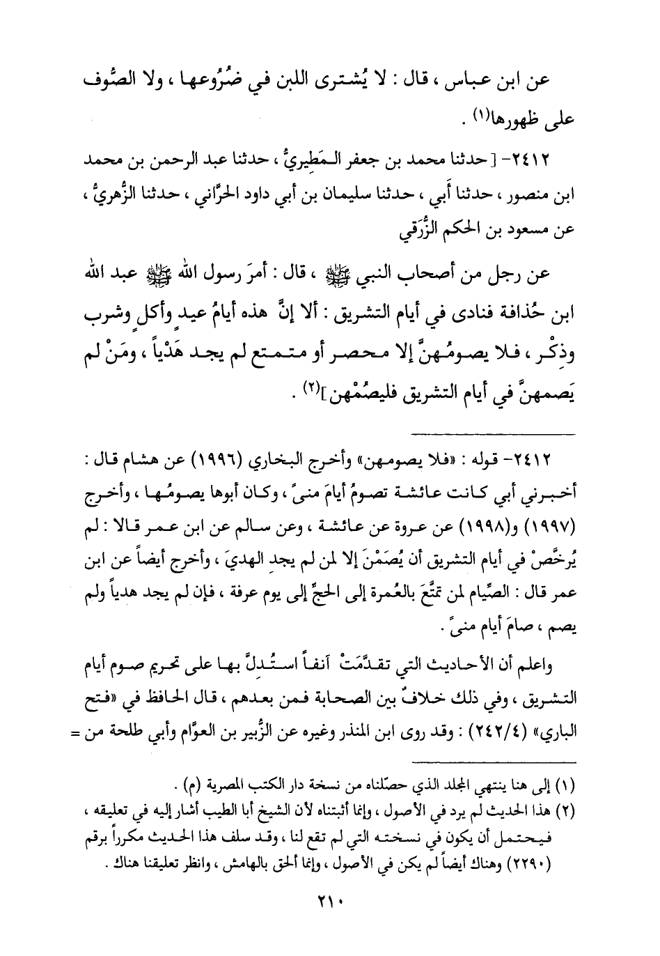 2412 - حَدَّثَنَا مُحَمَّدُ بْنُ جَعْفَرٍ الْمَطِيرِيُّ , ثنا عَبْدُ الرَّحْمَنِ بْنُ مُحَمَّدِ بْنِ مَنْصُورٍ , ثنا أَبِي , حَدَّثَنَا سُلَيْمَانُ بْنُ أَبِي دَاوُدَ الْحَرَّانِيُّ , ثنا الزُّهْرِيُّ , عَنْ مَسْعُودِ بْنِ الْحَكَمِ الزُّرَقِيِّ , عَنْ رَجُلٍ مِنْ أَصْحَابِ النَّبِيِّ صَلَّى اللهُ عَلَيْهِ وَسَلَّمَ , قَالَ: أَمَرَ رَسُولُ اللَّهِ صَلَّى اللهُ عَلَيْهِ وَسَلَّمَ عَبْدَ اللَّهِ بْنَ حُذَافَةَ فَنَادَى فِي أَيَّامِ التَّشْرِيقِ: «أَلَا إِنَّ §هَذِهِ الْأَيَّامَ عِيدٌ وَأَكْلٌ وَشُرْبٌ وَذِكْرٌ فَلَا تَصُومُوهُنَّ إِلَّا مُحْصَرٌ