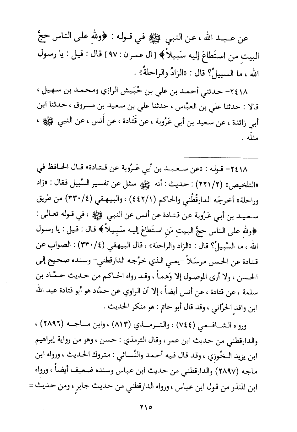 عَنْ عَبْدِ اللَّهِ , عَنِ النَّبِيِّ صَلَّى اللهُ عَلَيْهِ وَسَلَّمَ فِي قَوْلِهِ {وَلِلَّهِ عَلَى النَّاسِ حِجُّ الْبَيْتِ مَنِ اسْتَطَاعَ إِلَيْهِ سَبِيلًا} [آل عمران: 97] , قَالَ: " قِيلَ: يَا رَسُولَ اللَّهِ §مَا السَّبِيلُ , قَالَ: «الزَّادُ وَالرَّاحِلَةُ».