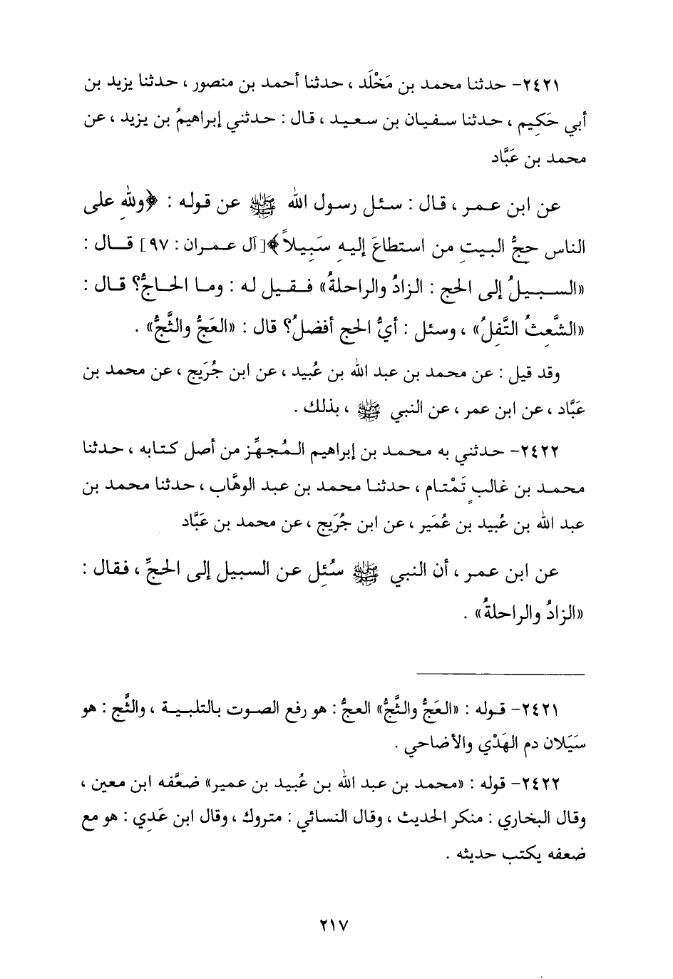 2421 - نا مُحَمَّدُ بْنُ مَخْلَدٍ , نا أَحْمَدُ بْنُ مَنْصُورٍ , نا يَزِيدُ بْنُ أَبِي حَكِيمٍ , نا سُفْيَانُ بْنُ سَعِيدٍ , حَدَّثَنِي إِبْرَاهِيمُ بْنُ يَزِيدَ , عَنْ مُحَمَّدِ بْنِ عَبَّادٍ , عَنِ ابْنِ عُمَرَ , قَالَ: سُئِلَ رَسُولُ اللَّهِ صَلَّى اللهُ عَلَيْهِ وَسَلَّمَ عَنْ قَوْلِهِ {وَلِلَّهِ عَلَى النَّاسِ حِجُّ الْبَيْتِ مَنِ اسْتَطَاعَ إِلَيْهِ سَبِيلًا} [آل عمران: 97] , قَالَ: " §السَّبِيلُ إِلَى الْحَجِّ: الزَّادُ وَالرَّاحِلَةُ " , فَقِيلَ لَهُ: وَمَا الْحَاجُّ؟ , قَالَ: «الشَّعْثُ التَّفْلُ» , وَسُئِلَ: أَيُّ الْحَجِّ أَفْضَلُ؟ , قَالَ: «الْعَجُّ وَالثَّجُّ»