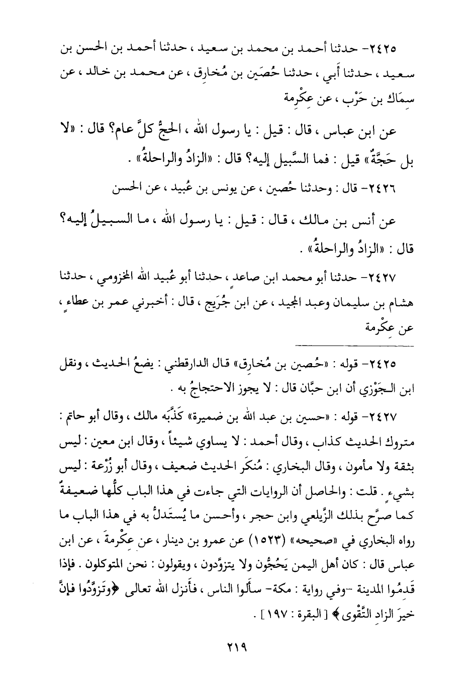 2426 - قَالَ: وَنا حُصَيْنٌ , عَنْ يُونُسَ بْنِ عُبَيْدٍ , عَنِ الْحَسَنِ , عَنْ أَنَسِ بْنِ مَالِكٍ , قَالَ: قِيلَ: يَا رَسُولَ اللَّهِ §مَا السَّبِيلُ إِلَيْهِ؟ , قَالَ: «الزَّادُ وَالرَّاحِلَةُ»
