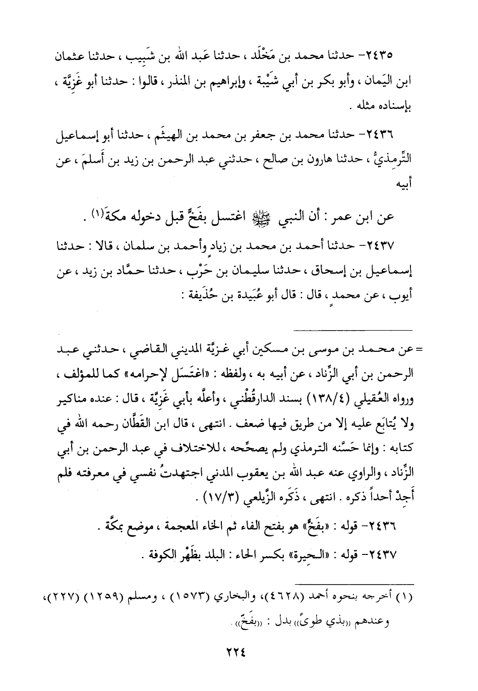 2436 - نا مُحَمَّدُ بْنُ جَعْفَرِ بْنِ مُحَمَّدِ بْنِ الْهَيْثَمِ , نا أَبُو إِسْمَاعِيلَ التِّرْمِذِيُّ , نا هَارُونُ بْنُ صَالِحٍ , حَدَّثَنِي عَبْدُ الرَّحْمَنِ بْنُ زَيْدِ بْنِ أَسْلَمَ , عَنْ أَبِيهِ , عَنِ ابْنِ عُمَرَ , أَنَّ رَسُولَ اللَّهِ صَلَّى اللهُ عَلَيْهِ وَسَلَّمَ § «اغْتَسَلَ بِفَخٍّ قَبْلَ دُخُولِهِ مَكَّةَ»