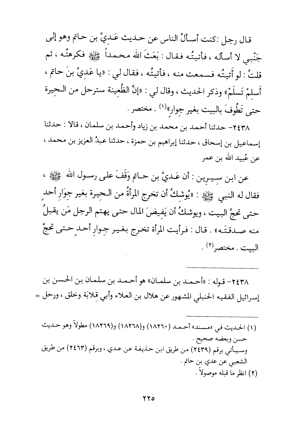 2439 - حَدَّثَنَا إِبْرَاهِيمُ بْنُ حَمَّادٍ , ثنا أَبُو مُوسَى مُحَمَّدُ بْنُ الْمُثَنَّى , نا مُحَمَّدُ بْنُ عَبْدِ اللَّهِ الْأَنْصَارِيُّ , نا ابْنُ عَوْنٍ , عَنْ مُحَمَّدٍ , حَدَّثَنِي ابْنُ حُذَيْفَةَ - شَكَّ ابْنُ عَوْنٍ - اسْمُهُ مُحَمَّدُ بْنُ حُذَيْفَةَ , قَالَ: قُلْتُ: نَتَحَدَّثُ بِحَدِيثِ عَدِيِّ بْنِ حَاتِمٍ وَكَانَ فِي نَاحِيَةِ الْكُوفَةِ , قَالَ: قُلْتُ: لَوْ أَتَيْتُهُ فَكُنْتُ أَنَا الَّذِي أَسْمَعُهُ مِنْهُ فَأَتَيْتُهُ , فَقُلْتُ: حَدِيثٌ بَلَغَنِي عَنْكَ أَرَدْتُ أَنْ أَكُونَ أَنَا أَسْمَعُهُ مِنْكَ , قَالَ: فَقَالَ: لَمَّا بُعِثَ رَسُولُ اللَّهِ صَلَّى اللهُ عَلَيْهِ وَسَلَّمَ فَرَرْتُ حَتَّى كُنْتُ بِأَقْصَى أَرْضِ أَهْلِ الْإِسْلَامِ , ثُمَّ قُلْتُ: لَآتِيَنَّ هَذَا الرَّجُلَ فَإِنْ كَانَ صَادِقًا فَلَأَسْمَعَنَّ مِنْهُ , فَلَمَّا جِئْتُ اسْتَشْرَفَ لِي النَّاسُ فَذَكَرَ لِي الْحَدِيثَ. قَالَ: ثُمَّ قَالَ لِي: «أَتَيْتَ الْحِيرَةَ؟» , قُلْتُ: لَا وَقَدْ عَلِمْتُ مَكَانَهَا , قَالَ: «فَتُوشِكُ الظَّعِينَةُ أَنْ تَخْرُجَ مِنْهَا بِغَيْرِ جِوَارٍ حَتَّى تَطُوفَ بِالْكَعْبَةِ». قَالَ: فَرَأَيْتُ الظَّعِينَةَ تَخْرُجُ مِنَ الْحِيرَةِ حَتَّى تَطُوفُ بِالْكَعْبَةِ , مُخْتَصَرٌ. -[227]- نا أَحْمَدُ بْنُ مُحَمَّدِ بْنِ زِيَادٍ , وَأَحْمَدُ بْنُ سَلْمَانَ , قَالَا: نا إِسْمَاعِيلُ بْنُ إِسْحَاقَ , نا سُلَيْمَانُ بْنُ حَرْبٍ , نا حَمَّادُ بْنُ زَيْدٍ , عَنْ أَيُّوبَ , عَنْ مُحَمَّدٍ , قَالَ: قَالَ أَبُو عُبَيْدَةَ بْنُ حُذَيْفَةَ: قَالَ رَجُلٌ: كُنْتُ أَسْأَلُ النَّاسَ عَنْ حَدِيثِ عَدِيِّ بْنِ حَاتِمٍ وَهُوَ إِلَى جَنْبِي لَا أَسْأَلُهُ فَأَتَيْتُهُ , فَقَالَ: «يَا عَدِيُّ بْنُ حَاتِمٍ أَسْلِمْ تَسْلَمْ» فَذَكَرَ الْحَدِيثَ. وَقَالَ لِي: «فَإِنَّ الظَّعِينَةَ سَتَرْحَلُ مِنَ الْحِيرَةِ حَتَّى تَطُوفَ بِالْبَيْتِ بِغَيْرِ جِوَارٍ» , مُخْتَصَرٌ
