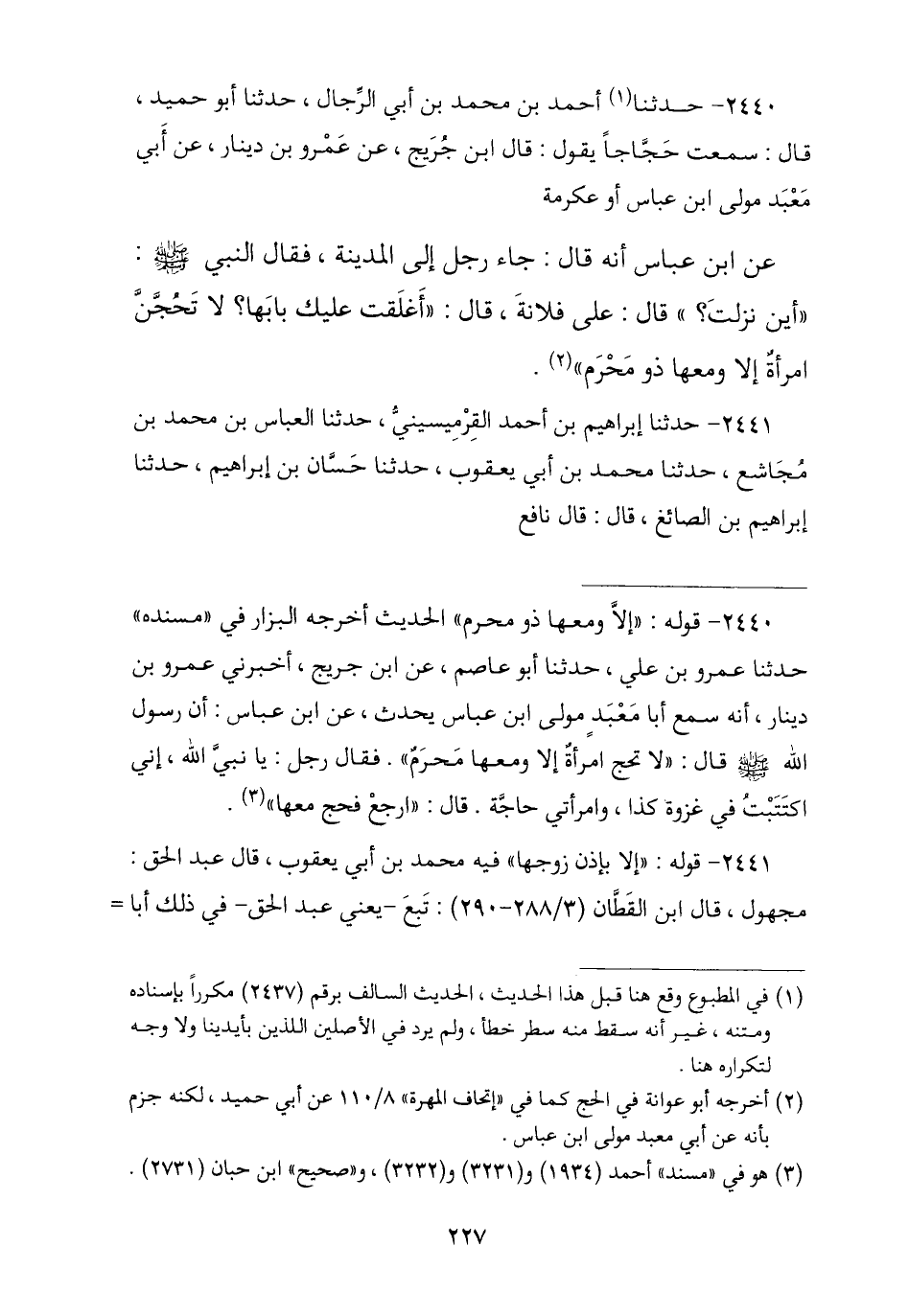 2440 - نا أَحْمَدُ بْنُ مُحَمَّدِ بْنِ أَبِي الرِّجَالِ , نا أَبُو حُمَيْدٍ , قَالَ: سَمِعْتُ حُجَّاجًا , يَقُولُ: قَالَ ابْنُ جُرَيْجٍ , عَنْ عَمْرِو بْنِ دِينَارٍ , عَنْ أَبِي مَعْبَدٍ مَوْلَى ابْنِ عَبَّاسٍ أَوْ عِكْرِمَةَ , عَنِ ابْنِ عَبَّاسٍ , أَنَّهُ قَالَ: جَاءَ رَجُلٌ إِلَى الْمَدِينَةِ , فَقَالَ النَّبِيُّ صَلَّى اللهُ عَلَيْهِ وَسَلَّمَ: «أَيْنَ نَزَلْتَ؟» , قَالَ: عَلَى فُلَانَةَ , قَالَ: «أَغْلَقْتَ عَلَيْكَ بَابَهَا §لَا تَحُجَّنَّ امْرَأَةٌ إِلَّا وَمَعَهَا ذُو مُحْرِمٍ»