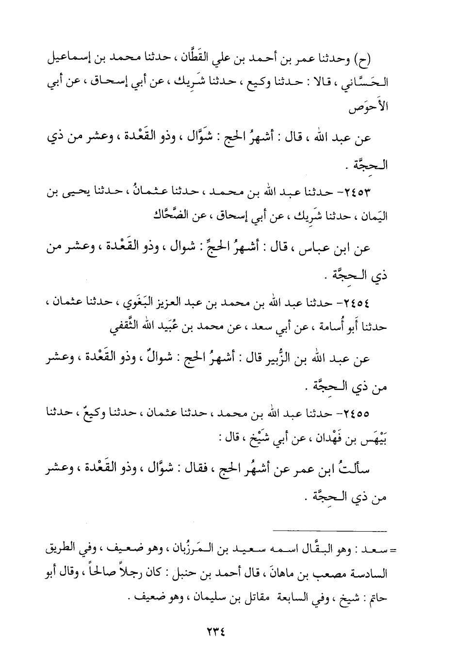 2453 - نا عَبْدُ اللَّهِ بْنُ مُحَمَّدٍ , نا عُثْمَانُ , نا يَحْيَى بْنُ الْيَمَانِ , نا شَرِيكٌ , عَنْ أَبِي إِسْحَاقَ , عَنِ الضَّحَّاكِ , عَنِ ابْنِ عَبَّاسٍ , قَالَ: § «أَشْهُرُ الْحَجِّ شَوَّالٌ وَذُو الْقَعْدَةِ وَعَشْرٌ مِنْ ذِي الْحِجَّةِ»