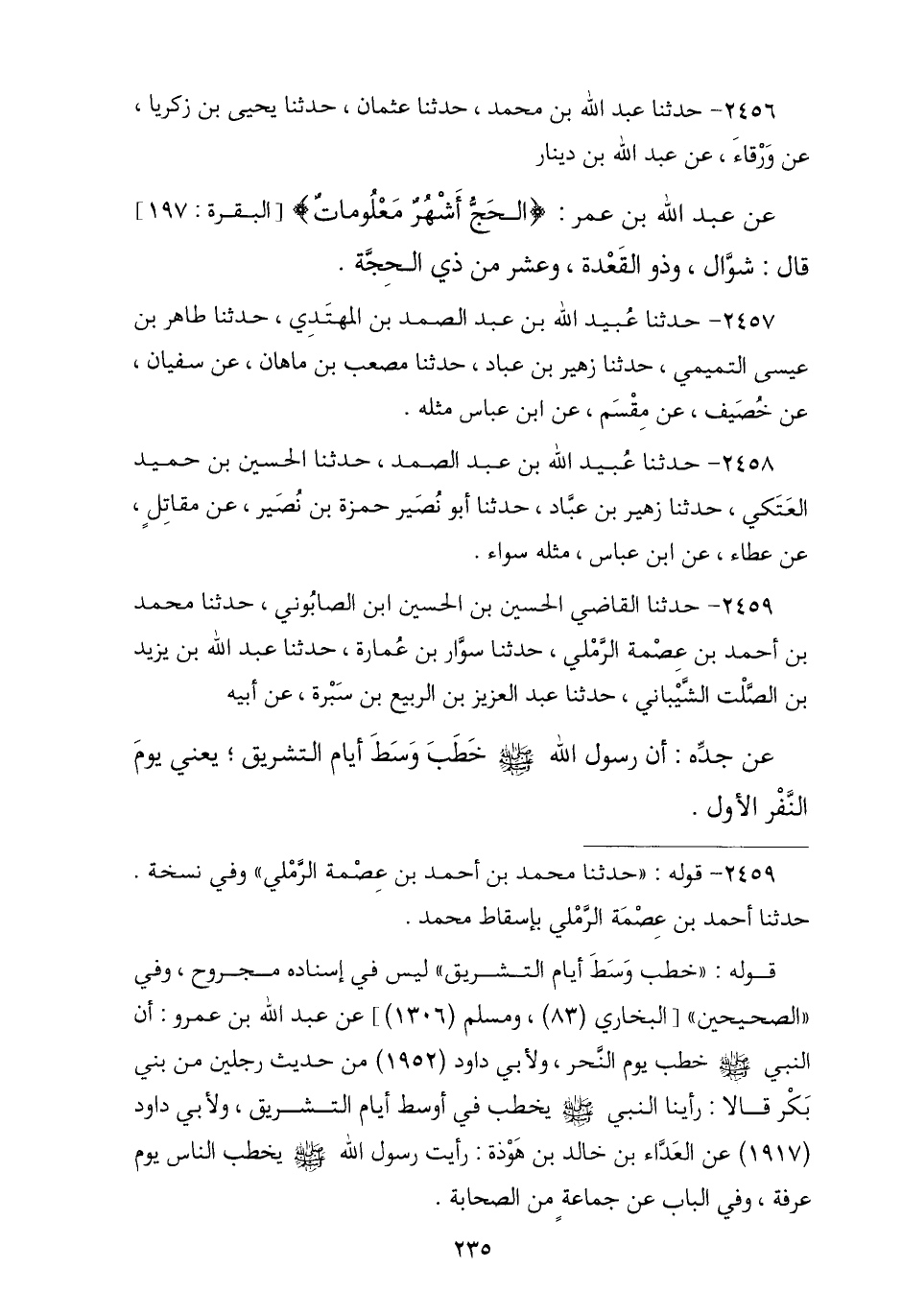 2459 - نا الْحُسَيْنُ بْنُ الْحُسَيْنِ بْنِ الصَّابُونِيِّ , نا مُحَمَّدُ بْنُ أَحْمَدَ بْنِ عِصْمَةَ الرَّمْلِيُّ , نا سَوَّارُ بْنُ عُمَارَةَ , نا عَبْدُ اللَّهِ بْنُ يَزِيدَ بْنِ الصَّلْتِ الشَّيْبَانِيُّ , نا عَبْدُ الْعَزِيزِ بْنُ الرَّبِيعِ بْنِ سَبْرَةَ , عَنْ أَبِيهِ , عَنْ جَدِّهِ , أَنَّ رَسُولَ اللَّهِ صَلَّى اللهُ عَلَيْهِ وَسَلَّمَ «§خَطَبَ وَسَطَ أَيَّامِ التَّشْرِيقِ». يَعْنِي: يَوْمَ النَّفْرِ الْأَوَّلِ
