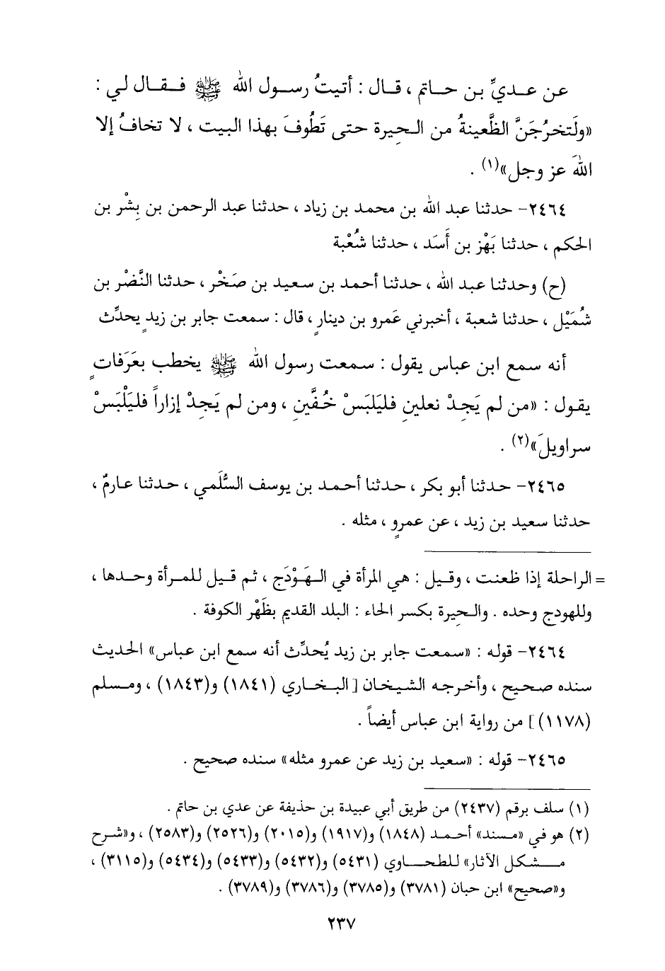 2464 - نا عَبْدُ اللَّهِ بْنُ مُحَمَّدِ بْنِ زِيَادٍ , نا عَبْدُ الرَّحْمَنِ بْنُ بِشْرٍ يَعْنِي ابْنَ الْحَكَمِ , نا بَهْزُ بْنُ أَسَدٍ , نا شُعْبَةُ , ح وَثنا عَبْدُ اللَّهِ , نا أَحْمَدُ بْنُ سَعِيدِ بْنِ صَخْرٍ , نا النَّضْرُ بْنُ شُمَيْلٍ , نا شُعْبَةُ , أَخْبَرَنِي عَمْرُو بْنُ دِينَارٍ , قَالَ: سَمِعْتُ جَابِرَ بْنَ زَيْدٍ , يُحَدِّثُ أَنَّهُ سَمِعَ ابْنَ عَبَّاسٍ , يَقُولُ: سَمِعْتُ رَسُولَ اللَّهِ صَلَّى اللهُ عَلَيْهِ وَسَلَّمَ يَخْطُبُ بِعَرَفَاتٍ يَقُولُ: § «مَنْ لَمْ يَجِدْ نَعْلَيْنِ فَلْيَلْبَسْ خُفَّيْنِ , وَمَنْ لَمْ يَجِدْ إِزَارًا فَلْيَلْبَسْ سَرَاوِيلَ».