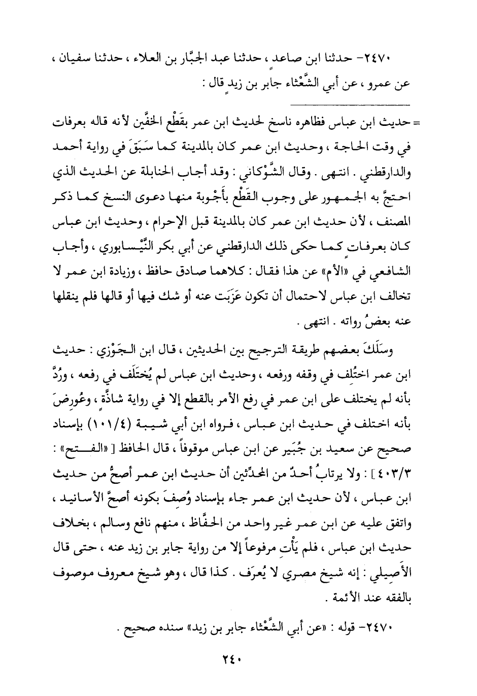 2470 - نا ابْنُ صَاعِدٍ , نا عَبْدُ الْجَبَّارِ بْنُ الْعَلَاءِ , نا سُفْيَانُ , عَنْ عَمْرٍو , عَنْ أَبِي الشَّعْثَاءِ جَابِرِ بْنِ زَيْدٍ , قَالَ: -[241]- سَمِعْتُ ابْنَ عَبَّاسٍ , يَقُولُ: سَمِعْتُ رَسُولَ اللَّهِ صَلَّى اللهُ عَلَيْهِ وَسَلَّمَ يَخْطُبُ وَهُوَ يَقُولُ: § «مَنْ لَمْ يَجِدْ نَعْلَيْنِ فَلْيَلْبَسْ خُفَّيْنِ , وَمَنْ لَمْ يَجِدْ إِزَارًا فَلْيَلْبَسْ سَرَاوِيلَ»