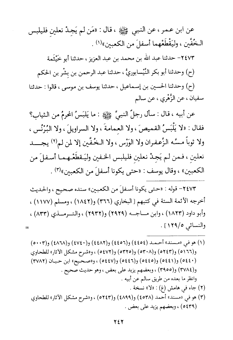 2473 - نا عَبْدُ اللَّهِ بْنُ مُحَمَّدِ بْنِ عَبْدِ الْعَزِيزِ، نا أَبُو خَيْثَمَةَ، ح وَنا أَبُو بَكْرٍ النَّيْسَابُورِيُّ، نا عَبْدُ الرَّحْمَنِ بْنُ بِشْرِ بْنِ الْحَكَمِ، ح وَنا الْحُسَيْنُ بْنُ إِسْمَاعِيلَ، نا يُوسُفُ بْنُ مُوسَى، قَالُوا: نا سُفْيَانُ، عَنِ الزُّهْرِيِّ، عَنْ سَالِمٍ، عَنْ أَبِيهِ، قَالَ: سَأَلَ رَجُلٌ النَّبِيَّ صَلَّى اللهُ عَلَيْهِ وَسَلَّمَ مَا يَلْبَسُ الْمُحْرِمُ مِنَ الثِّيَابِ؟، فَقَالَ: «§لَا يَلْبَسُ الْقَمِيصَ، وَلَا الْعِمَامَةَ، وَلَا السَّرَاوِيلَ، وَلَا الْبُرْنُسَ، وَلَا ثَوْبًا مَسَّهُ الْوَرْسُ، وَلَا الزَّعْفَرَانُ، وَلَا الْخُفَّيْنِ إِلَّا لِمَنْ لَمْ يَجِدْ نَعْلَيْنِ، فَمَنْ لَمْ يَجِدْ نَعْلَيْنِ فَلْيَلْبَسْ خُفَّيْنِ وَلْيَقْطَعْهُمَا أَسْفَلَ مِنَ الْكَعْبَيْنِ». وَقَالَ يُوسُفُ: حَتَّى يَكُونَا أَسْفَلَ مِنَ الْكَعْبَيْنِ