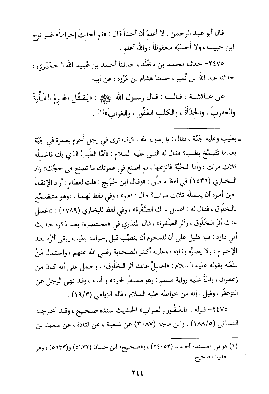 2475 - نا مُحَمَّدُ بْنُ مَخْلَدٍ، نا أَحْمَدُ بْنُ عُبَيْدِ اللَّهِ الْحِمْيَرِيُّ، ثنا عَبْدُ اللَّهِ بْنُ نُمَيْرٍ، نا هِشَامُ بْنُ عُرْوَةَ، عَنْ أَبِيهِ، عَنْ عَائِشَةَ، قَالَتْ: قَالَ رَسُولُ اللَّهِ صَلَّى اللهُ عَلَيْهِ وَسَلَّمَ: § «يَقْتُلُ الْمُحْرِمُ الْفَأْرَةَ وَالْعَقْرَبَ وَالْحِدَأَةَ وَالْكَلْبَ الْعَقُورَ وَالْغُرَابَ»