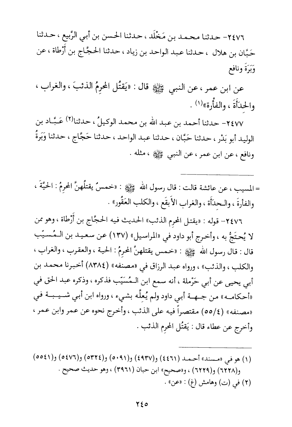 2476 - نا مُحَمَّدُ بْنُ مَخْلَدٍ، نا الْحَسَنُ بْنُ أَبِي الرَّبِيعِ، نا حَبَّانُ بْنُ هِلَالٍ، نا عَبْدُ الْوَاحِدِ بْنُ زِيَادٍ، نا الْحَجَّاجُ بْنُ أَرْطَأَةَ، عَنْ وَبَرَةَ، وَنَافِعٍ عَنِ ابْنِ عُمَرَ، أَنَّ النَّبِيَّ صَلَّى اللهُ عَلَيْهِ وَسَلَّمَ قَالَ: § «يَقْتُلُ الْمُحْرِمُ الذِّئْبَ وَالْغُرَابَ وَالْحِدَأَةَ وَالْفَأْرَةَ».