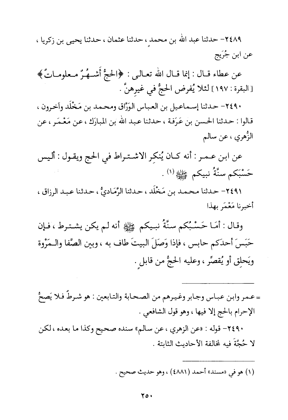 2490 - حَدَّثَنَا إِسْمَاعِيلُ بْنُ الْعَبَّاسِ الْوَرَّاقُ , وَمُحَمَّدُ بْنُ مَخْلَدٍ , وَآخَرُونَ قَالُوا: نا الْحَسَنُ بْنُ عَرَفَةَ , نا عَبْدُ اللَّهِ بْنُ الْمُبَارَكِ , عَنْ مَعْمَرٍ , عَنِ الزُّهْرِيِّ , عَنْ سَالِمٍ , عَنِ ابْنِ عُمَرَ , أَنَّهُ كَانَ §يُنْكِرُ الِاشْتِرَاطَ فِي الْحَجِّ , وَيَقُولُ: «أَلَيْسَ حَسْبُكُمْ سُنَّةَ نَبِيِّكُمْ صَلَّى اللهُ عَلَيْهِ وَسَلَّمَ»