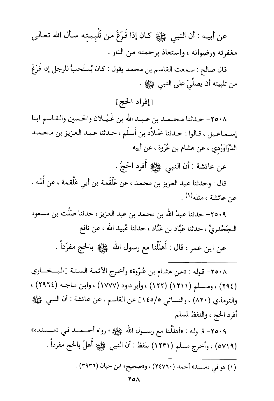 2508 - حَدَّثَنَا مُحَمَّدُ بْنُ عَبْدِ اللَّهِ بْنِ غَيْلَانَ , وَالْحُسَيْنُ , وَالْقَاسِمُ ابْنَا إِسْمَاعِيلَ , قَالُوا: نا خَلَّادُ بْنُ أَسْلَمَ , نا عَبْدُ الْعَزِيزِ بْنُ مُحَمَّدٍ الدَّرَاوَرْدِيُّ , عَنْ هِشَامِ بْنِ عُرْوَةَ , عَنْ أَبِيهِ , عَنْ عَائِشَةَ , أَنَّ النَّبِيَّ صَلَّى اللهُ عَلَيْهِ وَسَلَّمَ «§أَفْرَدَ الْحَجَّ». قَالَ: وَنا عَبْدُ الْعَزِيزِ بْنُ مُحَمَّدٍ , عَنْ عَلْقَمَةَ بْنِ أَبِي عَلْقَمَةَ , عَنْ أُمِّهِ , عَنْ عَائِشَةَ , مِثْلَهُ