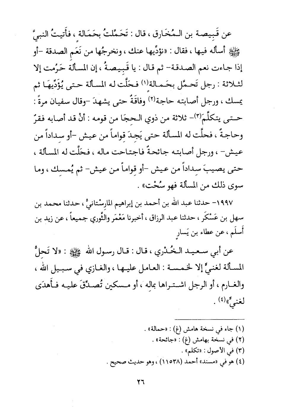 1997 - ثنا عَبْدُ اللَّهِ بْنُ أَحْمَدَ بْنِ إِبْرَاهِيمَ الْمَارِسْتَانِيُّ , ثنا مُحَمَّدُ بْنُ سَهْلِ بْنِ عَسْكَرٍ , ثنا عَبْدُ الرَّزَّاقِ , أنا مَعْمَرٌ , وَالثَّوْرِيُّ جَمِيعًا , عَنْ زَيْدِ بْنِ أَسْلَمَ , عَنْ عَطَاءِ بْنِ يَسَارٍ , عَنْ أَبِي سَعِيدٍ الْخُدْرِيِّ , قَالَ: قَالَ رَسُولُ اللَّهِ صَلَّى اللهُ عَلَيْهِ وَسَلَّمَ: " §لَا تَحِلُّ الْمَسْأَلَةُ لِغَنِيٍّ إِلَّا لِخَمْسَةٍ: الْعَامِلِ عَلَيْهَا , وَالْغَازِي فِي سَبِيلِ اللَّهِ , وَالْغَارِمِ , أَوِ الرَّجُلِ اشْتَرَاهَا بِمَالِهِ , أَوْ مِسْكِينٍ تُصُدِّقَ عَلَيْهِ فَأَهْدَى لِغَنِيٍّ ". -[27]-