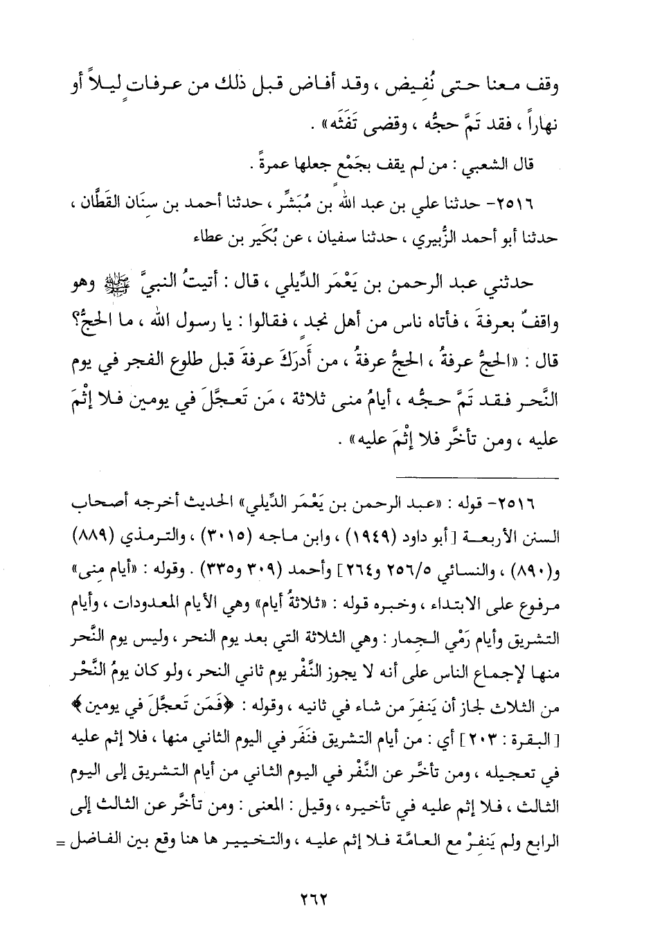 2516 - حَدَّثَنَا عَلِيُّ بْنُ عَبْدِ اللَّهِ بْنِ مُبَشِّرٍ , نا أَحْمَدُ بْنُ سِنَانٍ الْقَطَّانُ , نا أَبُو أَحْمَدَ الزُّبَيْرِيُّ , نا سُفْيَانُ , عَنْ بُكَيْرِ بْنِ عَطَاءٍ , حَدَّثَنِي عَبْدُ الرَّحْمَنِ بْنُ يَعْمَرَ الدِّيلِيُّ , قَالَ: أَتَيْتُ النَّبِيَّ صَلَّى اللهُ عَلَيْهِ وَسَلَّمَ وَهُوَ وَاقِفٌ بِعَرَفَةَ فَأَتَاهُ نَاسٌ مِنْ أَهْلِ نَجْدٍ , فَقَالُوا: يَا رَسُولَ اللَّهِ مَا الْحَجُّ؟ , قَالَ: § «الْحَجُّ عَرَفَةُ الْحَجُّ عَرَفَةُ , مَنْ أَدْرَكَ عَرَفَةَ قَبْلَ طُلُوعِ الْفَجْرِ فِي يَوْمِ النَّحْرِ فَقَدْ تَمَّ حَجُّهُ , أَيَّامُ مِنًى ثَلَاثَةٌ مَنْ تَعَجَّلَ فِي يَوْمَيْنِ فَلَا إِثْمَ عَلَيْهِ وَمَنْ تَأَخَّرَ فَلَا إِثْمَ عَلَيْهِ»