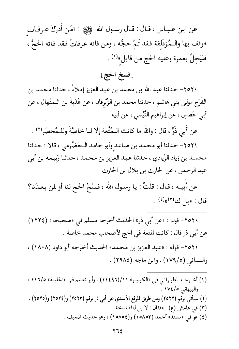 2521 - نا أَبُو مُحَمَّدِ بْنُ صَاعِدٍ , وَأَبُو حَامِدٍ الْحَضْرَمِيُّ قَالَا: نا مُحَمَّدُ بْنُ زِيَادٍ الزِّيَادِيُّ , نا عَبْدُ الْعَزِيزِ بْنُ مُحَمَّدٍ , نا رَبِيعَةُ بْنُ أَبِي عَبْدِ الرَّحْمَنِ , عَنِ الْحَارِثِ بْنِ بِلَالِ بْنِ الْحَارِثِ , عَنْ أَبِيهِ , قَالَ: قُلْتُ: يَا رَسُولَ اللَّهِ §فَسْخُ الْحَجِّ لَنَا أَوْ لِمَنْ بَعْدَنَا؟ , فَقَالَ: «لَا بَلْ لَنَا»