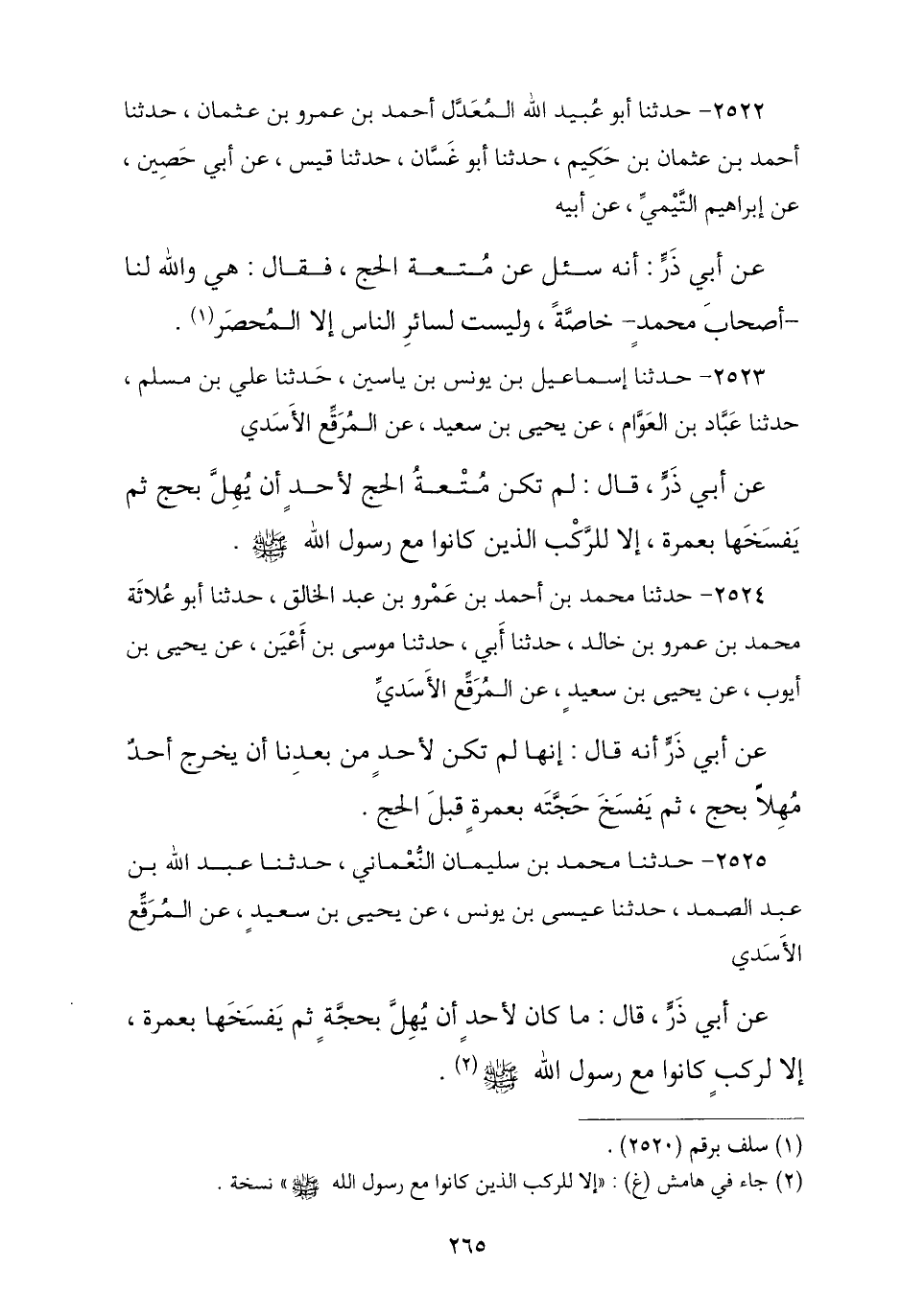 2525 - نا مُحَمَّدُ بْنُ سُلَيْمَانَ النُّعْمَانِيُّ , نا عَبْدُ اللَّهِ بْنُ عَبْدِ الصَّمَدِ , نا عِيسَى بْنُ يُونُسَ , عَنْ يَحْيَى بْنِ سَعِيدٍ , عَنِ الْمُرَقَّعِ الْأَسَدِيِّ , عَنْ أَبِي ذَرٍّ , قَالَ: § «مَا كَانَ لِأَحَدٍ أَنْ يُهِلَّ بِحَجَّةٍ ثُمَّ يَفْسَخُهَا بِعُمْرَةٍ إِلَّا لِرَكْبٍ كَانُوا مَعَ رَسُولِ اللَّهِ صَلَّى اللهُ عَلَيْهِ وَسَلَّمَ»