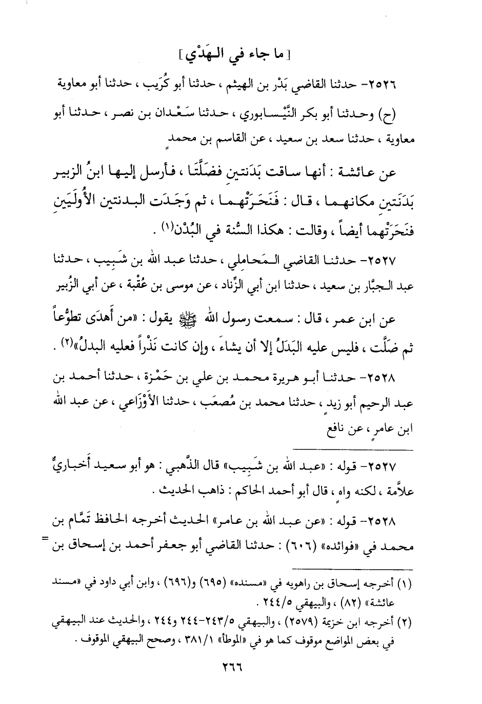 2526 - نا الْقَاضِي بَدْرُ بْنُ الْهَيْثَمِ , ثنا أَبُو كُرَيْبٍ , نا أَبُو مُعَاوِيَةَ , ح وَنا أَبُو بَكْرٍ النَّيْسَابُورِيُّ , ثنا سَعْدَانُ بْنُ نَصْرٍ , نا أَبُو مُعَاوِيَةَ , نا سَعْدُ بْنُ سَعِيدٍ , عَنِ الْقَاسِمِ بْنِ مُحَمَّدٍ , عَنْ عَائِشَةَ , أَنَّهَا §سَاقَتْ بَدَنَتَيْنِ فَضَلَتَا , فَأَرْسَلَ إِلَيْهَا ابْنُ الزُّبَيْرِ بَدَنَتَيْنِ مَكَانَهُمَا , قَالَ: فَنَحَرَتْهُمَا ثُمَّ وَجَدَتِ الْبَدَنَتَيْنِ الْأُولَيَيْنِ فَنَحَرَتْهُمَا , وَقَالَتْ: «هَكَذَا السُّنَّةُ فِي الْبُدْنِ»
