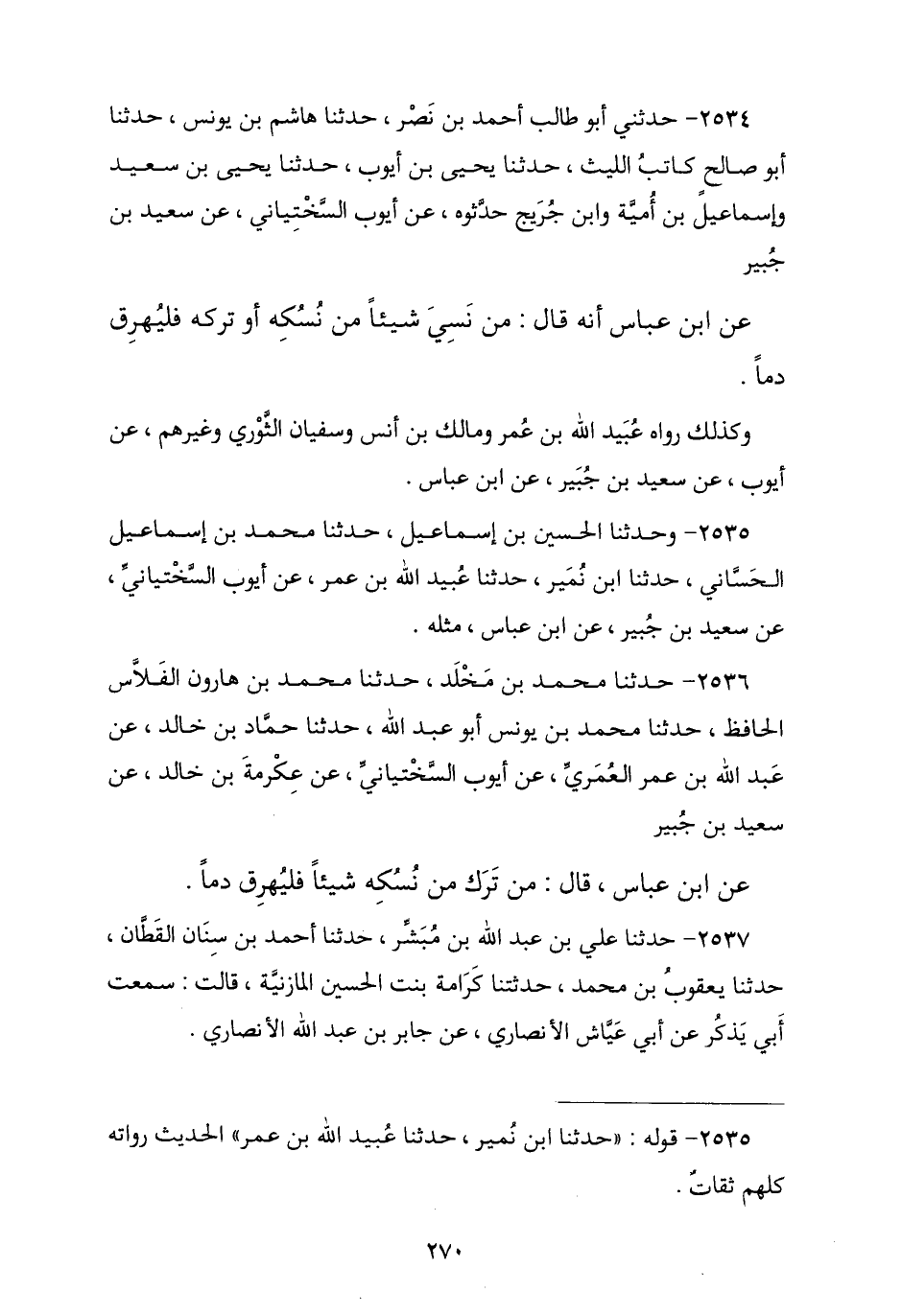 2534 - حَدَّثَنِي أَبُو طَالِبٍ أَحْمَدُ بْنُ نَصْرٍ ثنا هَاشِمُ بْنُ يُونُسَ , نا أَبُو صَالِحٍ , كَاتِبُ اللَّيْثِ نا يَحْيَى بْنُ أَيُّوبَ , عَنْ يَحْيَى بْنِ سَعِيدٍ , وَإِسْمَاعِيلَ بْنِ أُمَيَّةَ , وَابْنِ جُرَيْجٍ , حَدَّثُوهُ عَنْ أَيُّوبَ السَّخْتِيَانِيِّ , عَنْ سَعِيدِ بْنِ جُبَيْرٍ , عَنِ ابْنِ عَبَّاسٍ , أَنَّهُ قَالَ: § «مَنْ نَسِيَ شَيْئًا مِنْ نُسُكِهِ أَوْ تَرَكَهُ فَلْيُهْرِقْ دَمًا». وَكَذَلِكَ رَوَاهُ عُبَيْدُ اللَّهِ بْنُ عُمَرَ وَمَالِكُ بْنُ أَنَسٍ وَسُفْيَانُ الثَّوْرِيُّ وَغَيْرُهُمْ , عَنْ أَيُّوبَ عَنْ سَعِيدِ بْنِ جُبَيْرٍ , عَنِ ابْنِ عَبَّاسٍ.