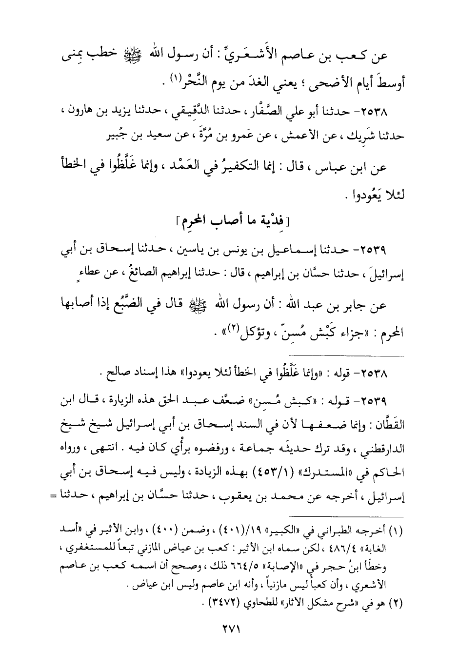 2538 - نا أَبُو عَلِيٍّ الصَّفَّارُ , نا الدَّقِيقِيُّ , نا يَزِيدُ بْنُ هَارُونَ , أنا شَرِيكٌ , عَنِ الْأَعْمَشِ , عَنْ عَمْرِو بْنِ مُرَّةَ , عَنْ سَعِيدِ بْنِ جُبَيْرٍ , عَنِ ابْنِ عَبَّاسٍ , قَالَ: «إِنَّمَا §التَّكْفِيرُ فِي الْعَمْدِ , وَإِنَّمَا غَلَّظُوا فِي الْخَطَأِ لِئَلَّا يَعُودُوا»